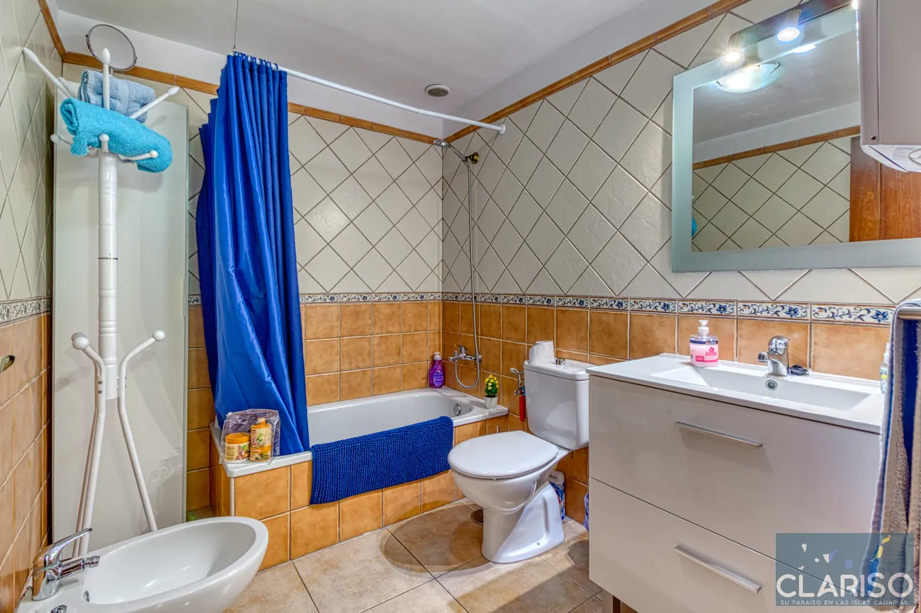 Das Badezimmer ist funktional eingerichtet mit WC, Waschbecken, Bidet und einer Sitzbadewanne, die dank Duschvorhang auch komfortabel als Dusche genutzt werden kann.