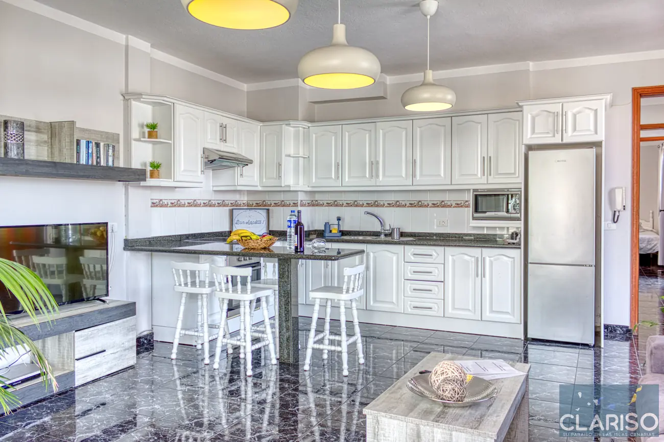 Das Apartment überzeugt durch ein helles und großzügiges Raumgefühl. Der Mittelpunkt ist das große Wohnzimmer mit offener Küche und Tresen. Ein bequemes Sofa und ein TV sorgen für entspannte Stunden, während die Küche funktionell ausgestattet ist und alles für Selbstversorger bietet.