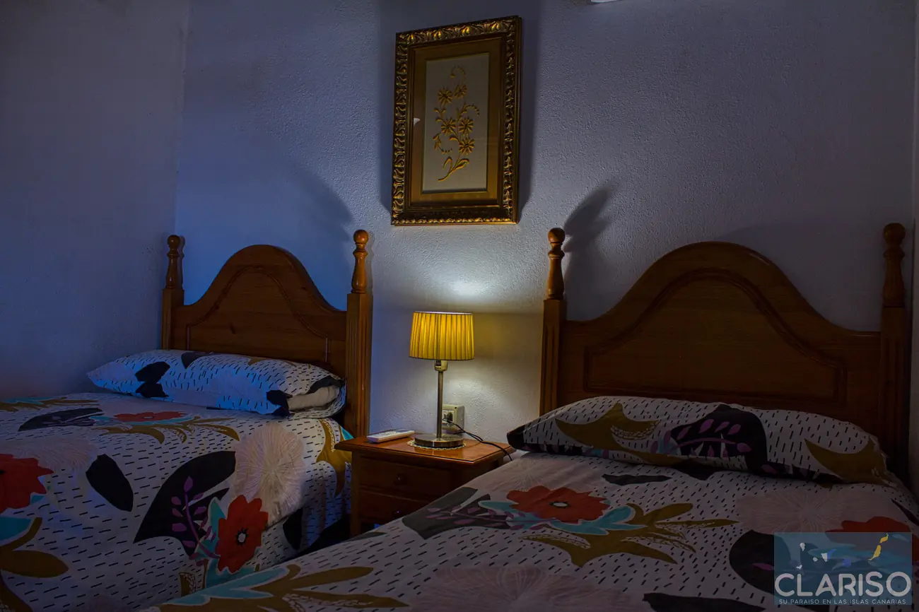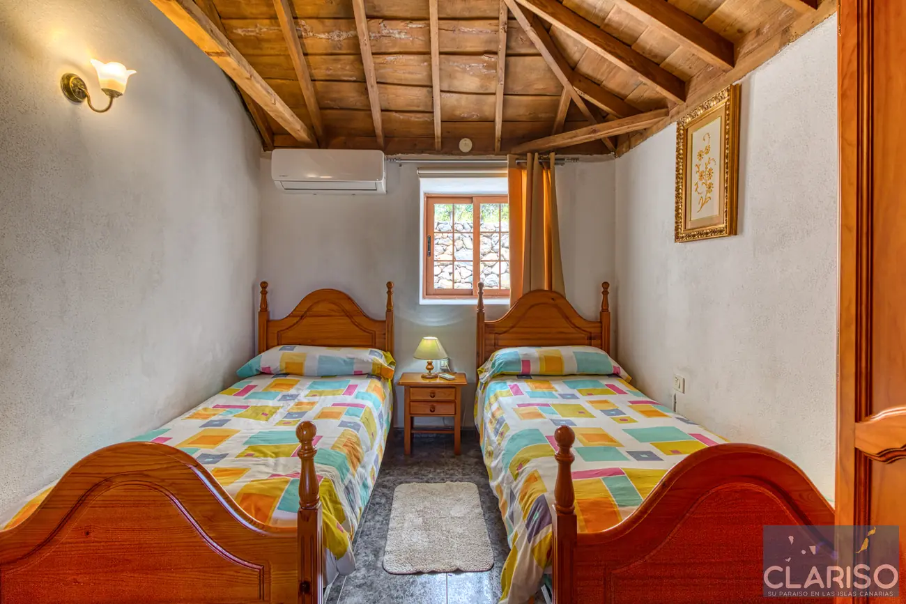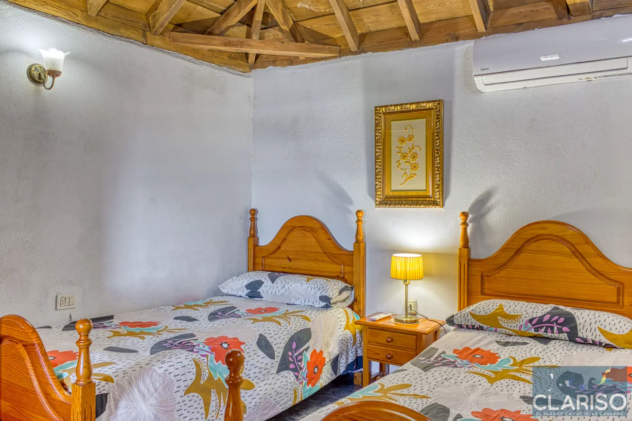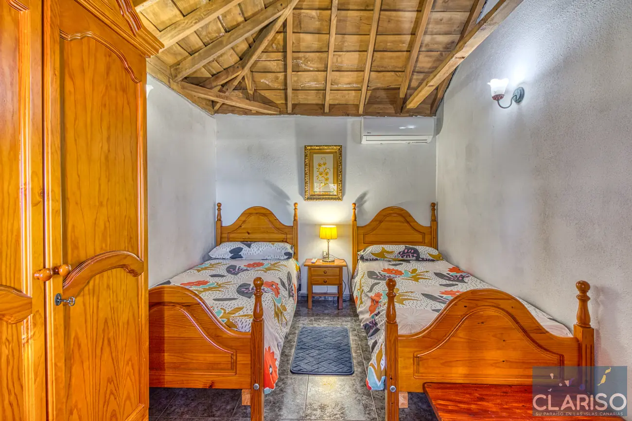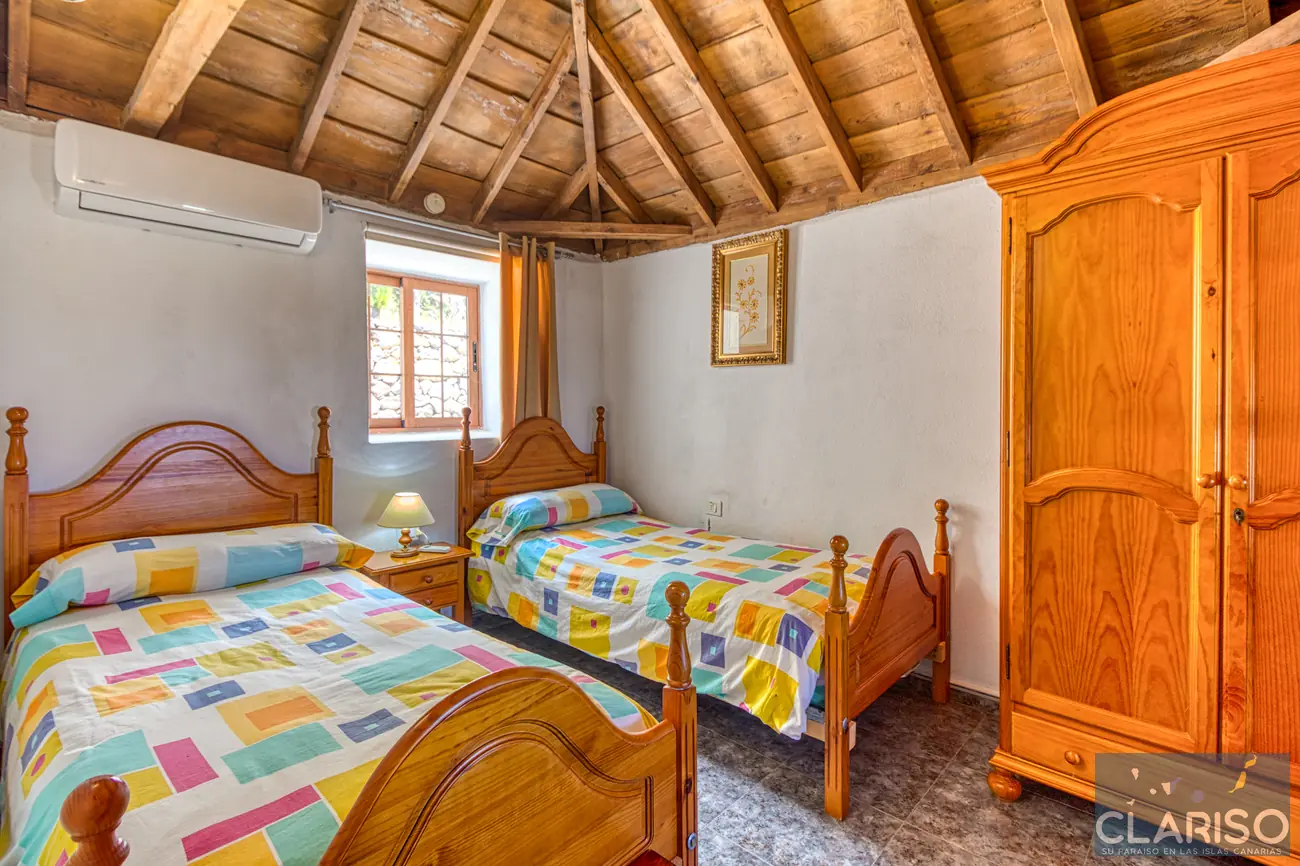 Casa Lorenzo dispone de dos dormitorios equivalentes con camas individuales y aire acondicionado. Entre ambos se encuentra una sala de lectura con sofá cama que puede utilizarse como zona adicional para dormir.
