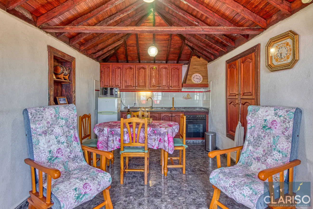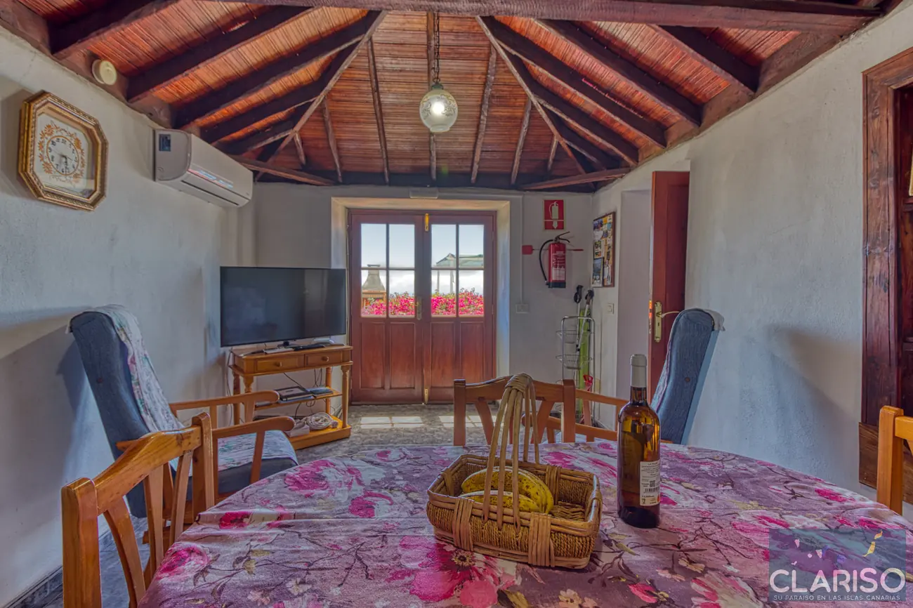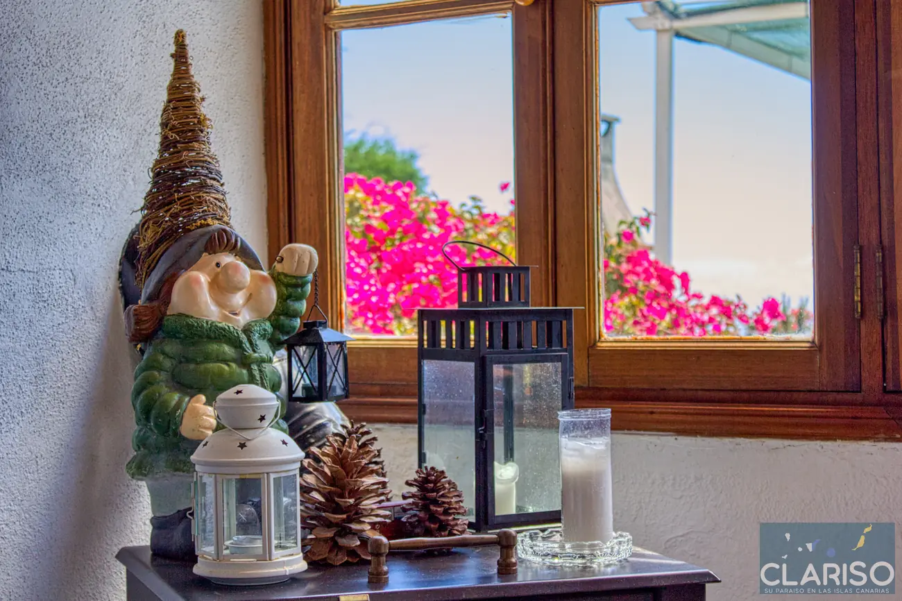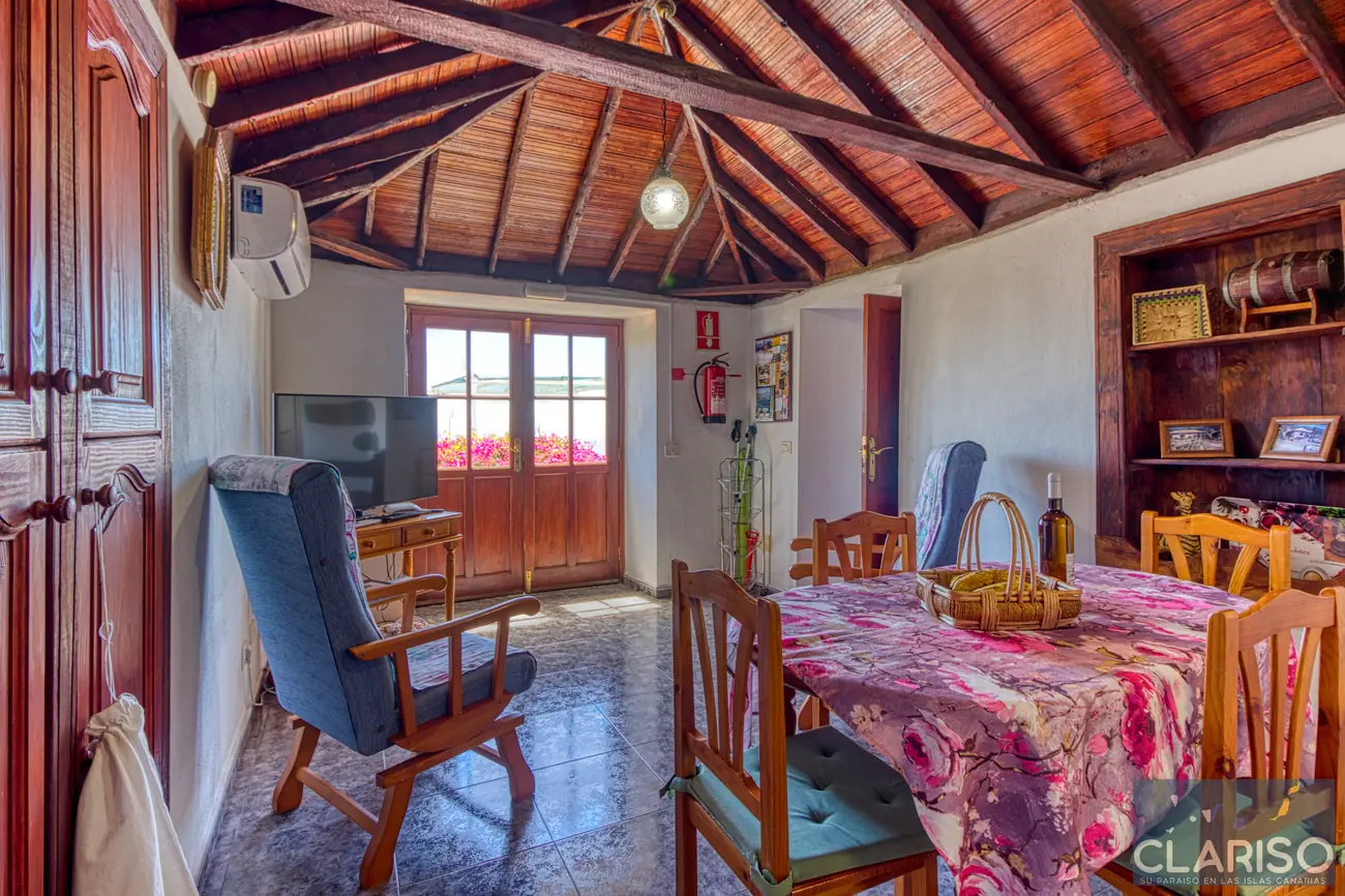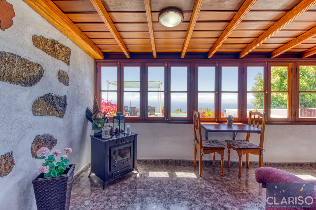 Desde el primer momento se percibe el estilo especial de esta casa: techos de madera canarios, paredes de piedra natural y un ambiente cálido y auténtico definen la sensación de hogar. La amplia zona de entrada es al mismo tiempo el corazón de la vivienda: un espacio luminoso con una gran fachada acristalada orientada al oeste, que ofrece vistas al jardín, a la piscina y al mar.