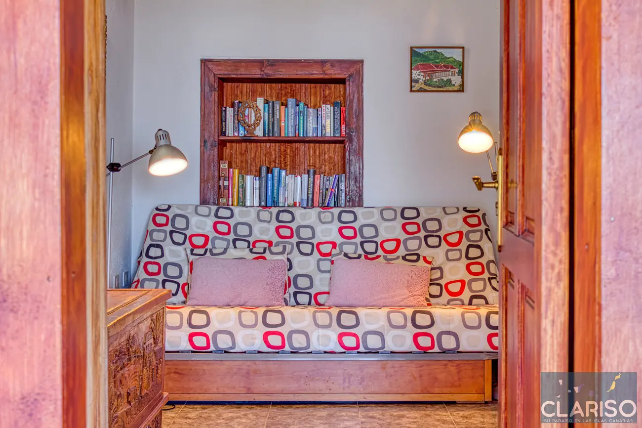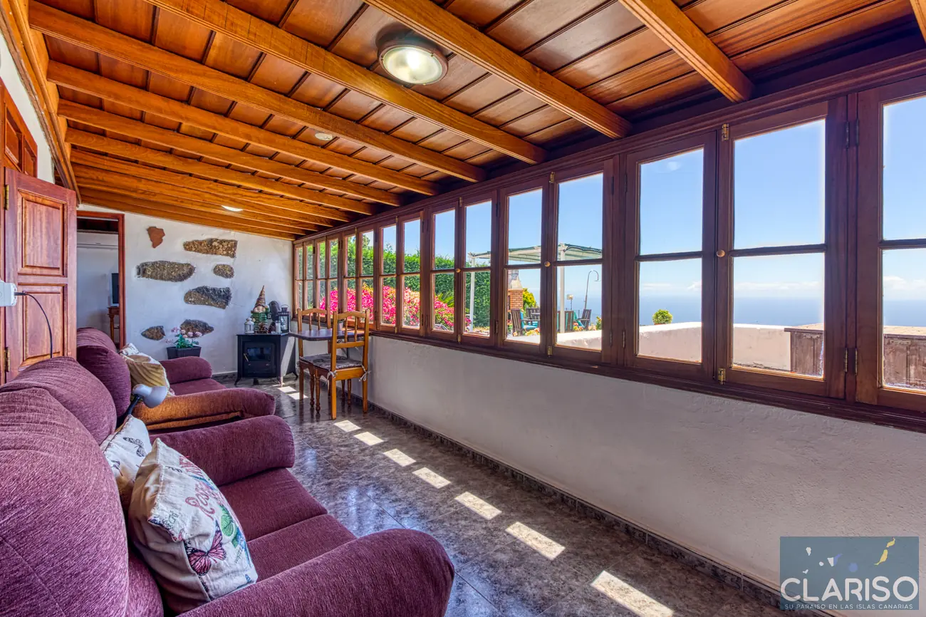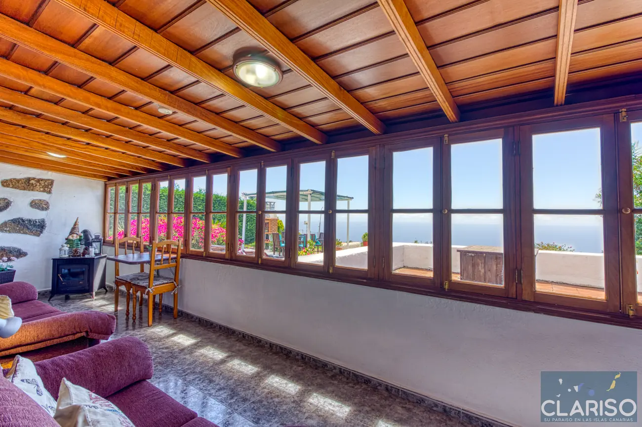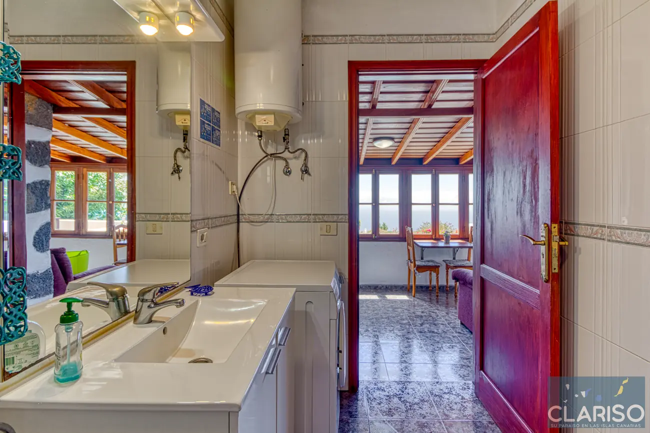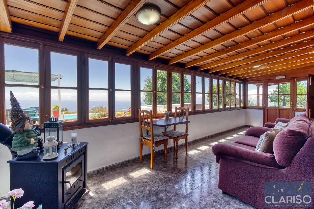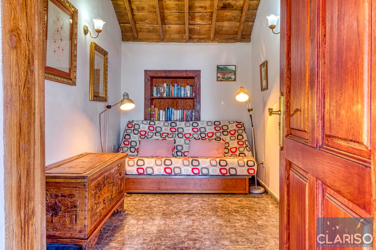 Desde el primer momento se percibe el estilo especial de esta casa: techos de madera canarios, paredes de piedra natural y un ambiente cálido y auténtico definen la sensación de hogar. La amplia zona de entrada es al mismo tiempo el corazón de la vivienda: un espacio luminoso con una gran fachada acristalada orientada al oeste, que ofrece vistas al jardín, a la piscina y al mar.