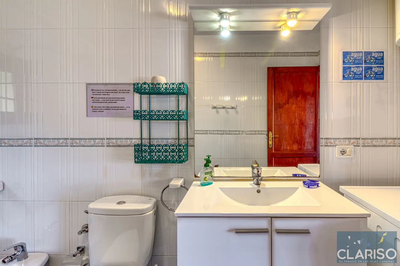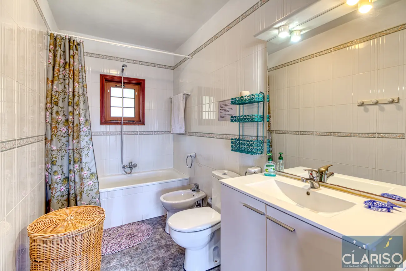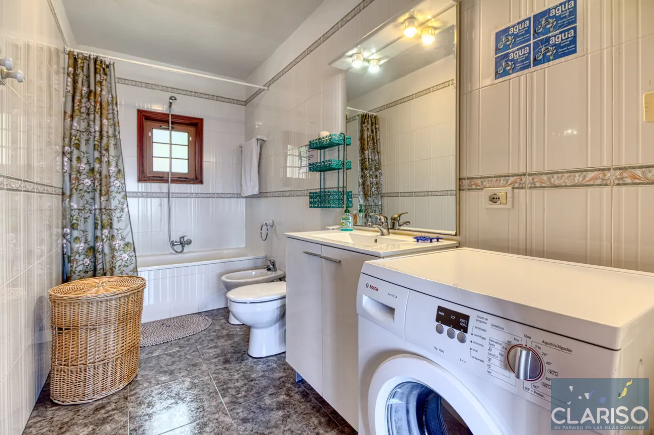 El amplio baño dispone de una bañera con opción de ducha, WC, bidé y lavadora, y está diseñado de forma funcional y cómoda.