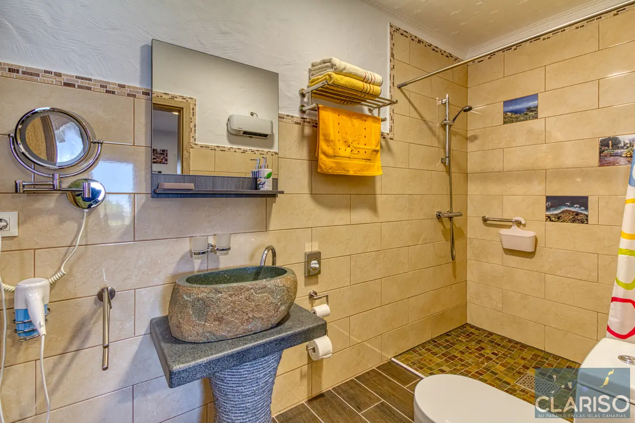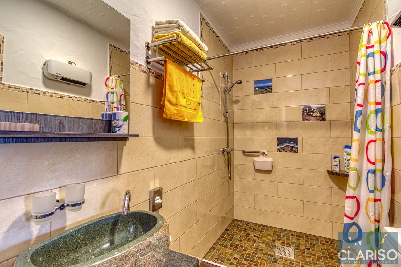 El moderno baño dispone de una ducha a ras de suelo, lavabo, WC, espejo de aumento y secador – luminoso, funcional y bien cuidado.