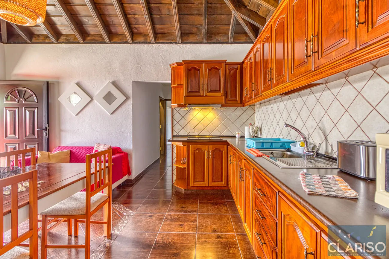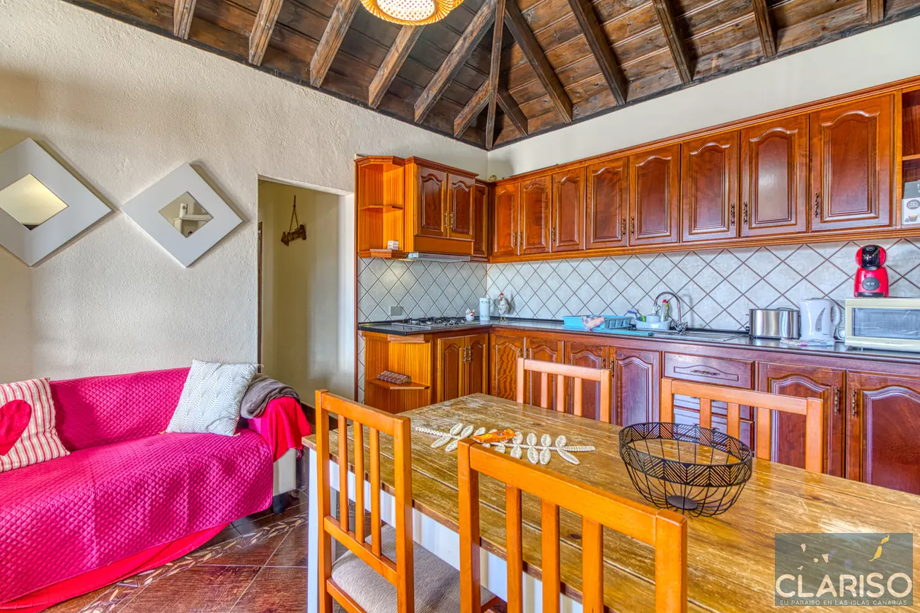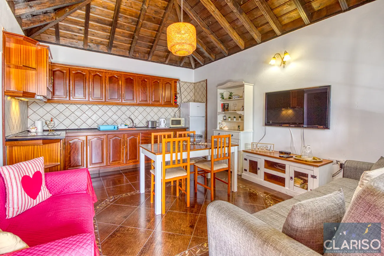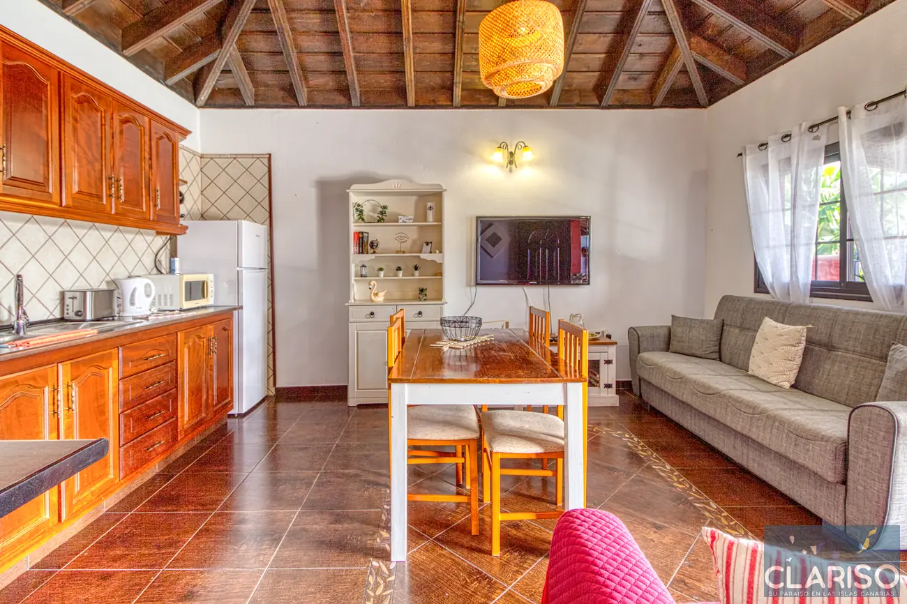 El salón está diseñado como un espacio abierto que combina zona de estar, comedor y cocina. Dos sofás cómodos invitan al descanso, una TV proporciona entretenimiento y la mesa del comedor ofrece espacio para comer en compañía. La cocina está bien equipada y es perfecta para quienes prefieren cocinar. Un bonito techo de madera canario aporta encanto tradicional y calidez al ambiente.