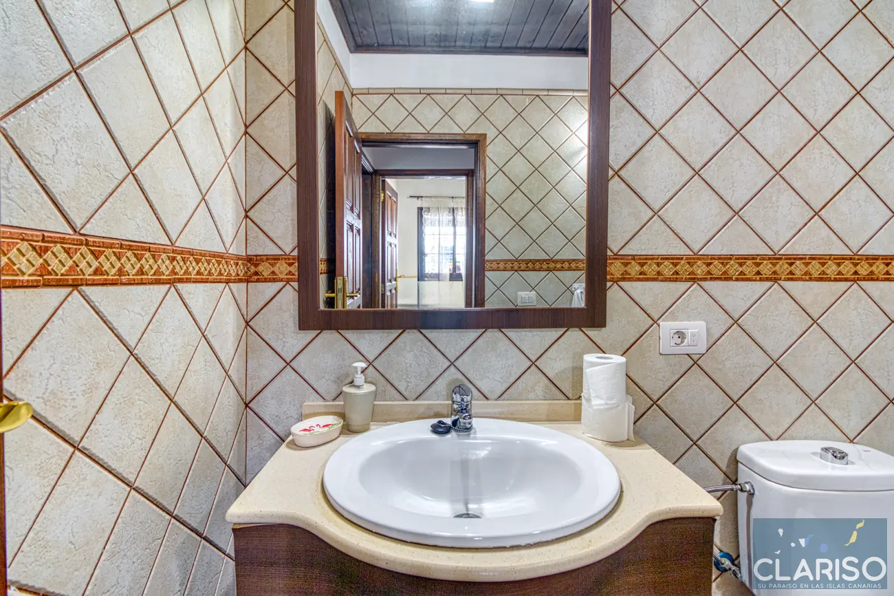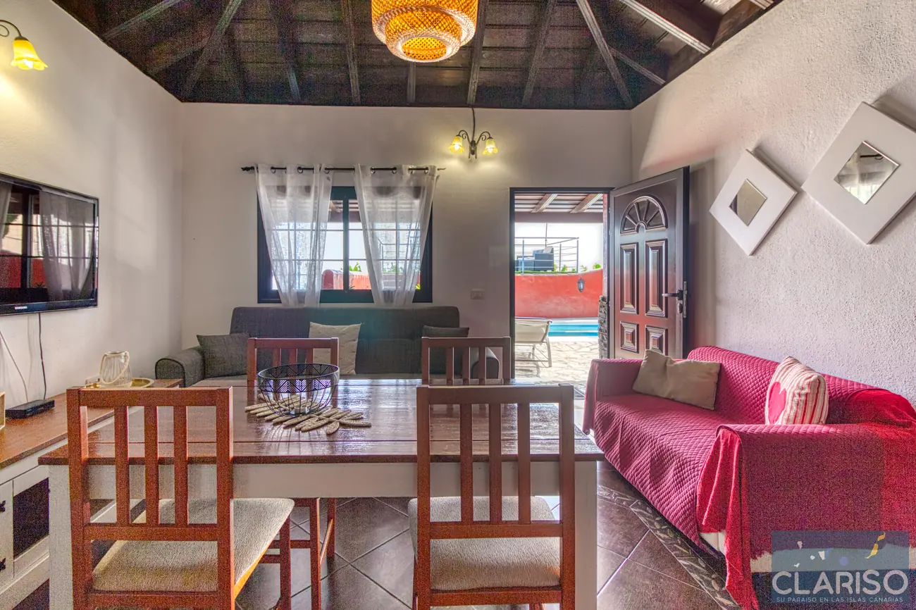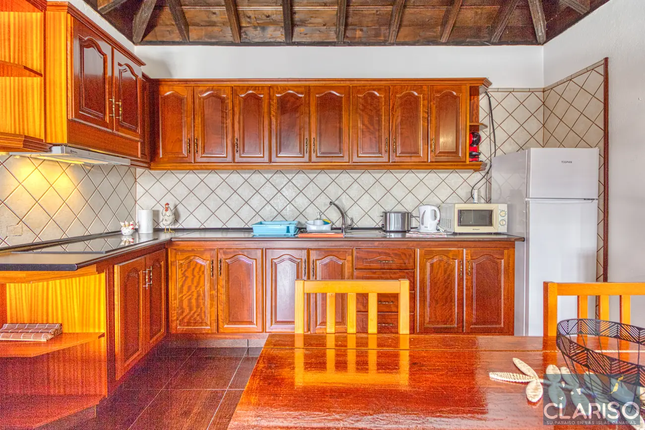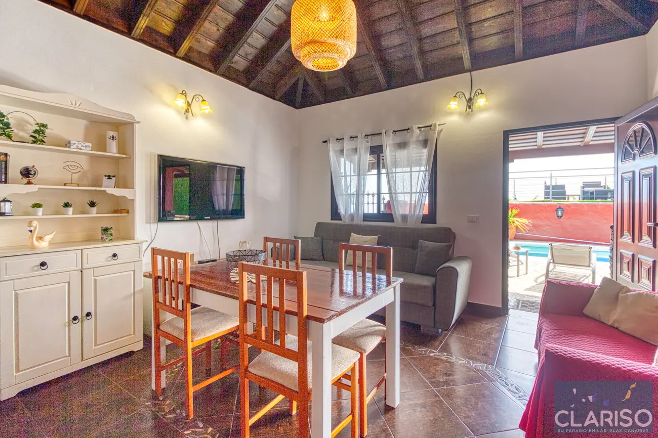 El salón está diseñado como un espacio abierto que combina zona de estar, comedor y cocina. Dos sofás cómodos invitan al descanso, una TV proporciona entretenimiento y la mesa del comedor ofrece espacio para comer en compañía. La cocina está bien equipada y es perfecta para quienes prefieren cocinar. Un bonito techo de madera canario aporta encanto tradicional y calidez al ambiente.