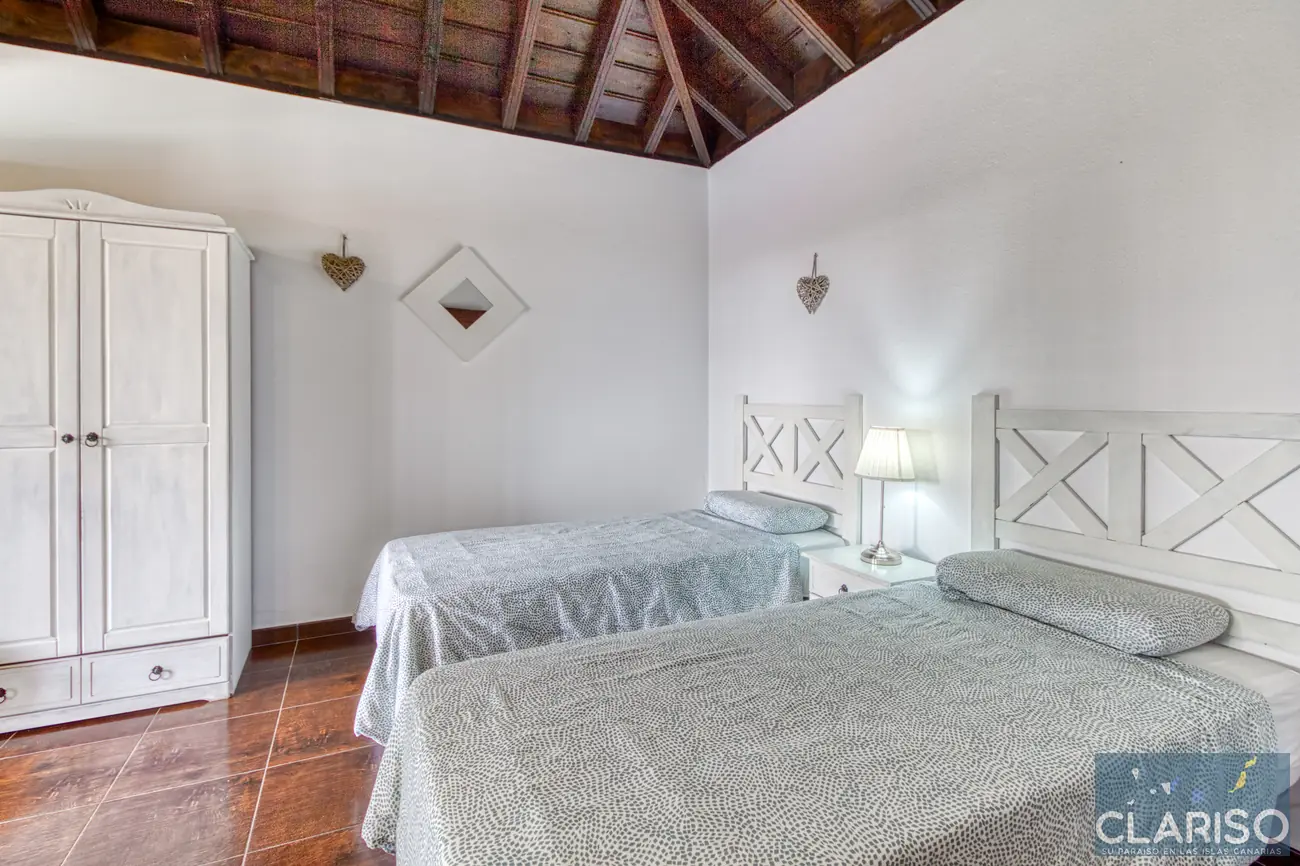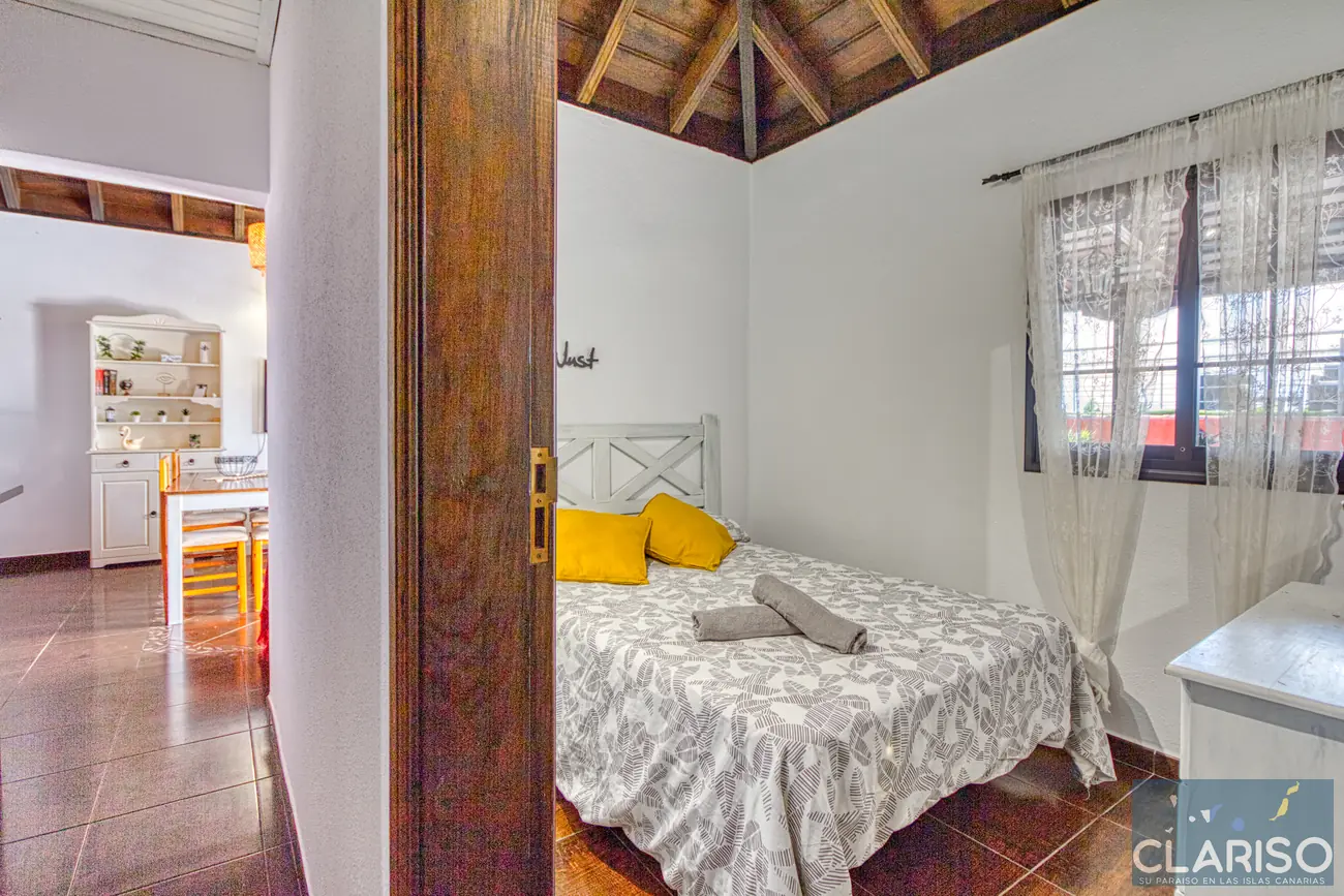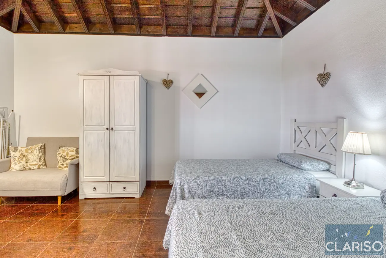 La casa ofrece dos dormitorios: uno con cama doble y otro con tres camas individuales, dos de ellas separadas por una mesita de noche, y una tercera cama ubicada algo aparte. Este dormitorio amplio también cuenta con un sillón ideal para leer o descansar. También aquí el techo de madera canario proporciona un ambiente típico y acogedor.