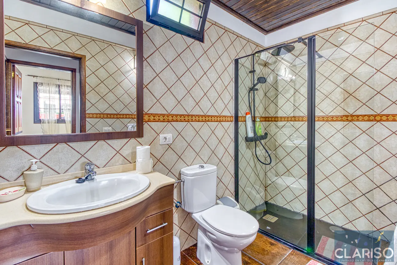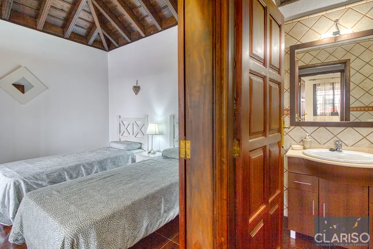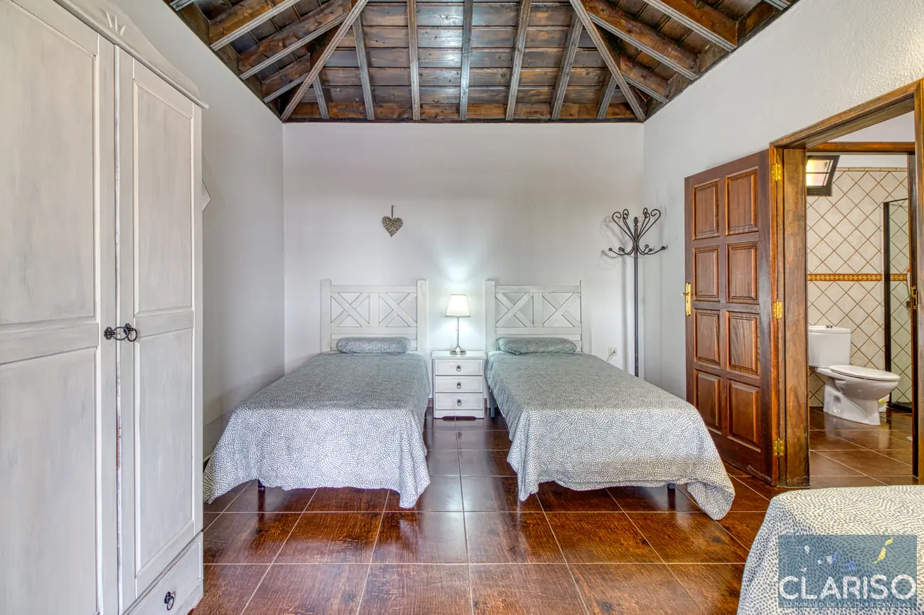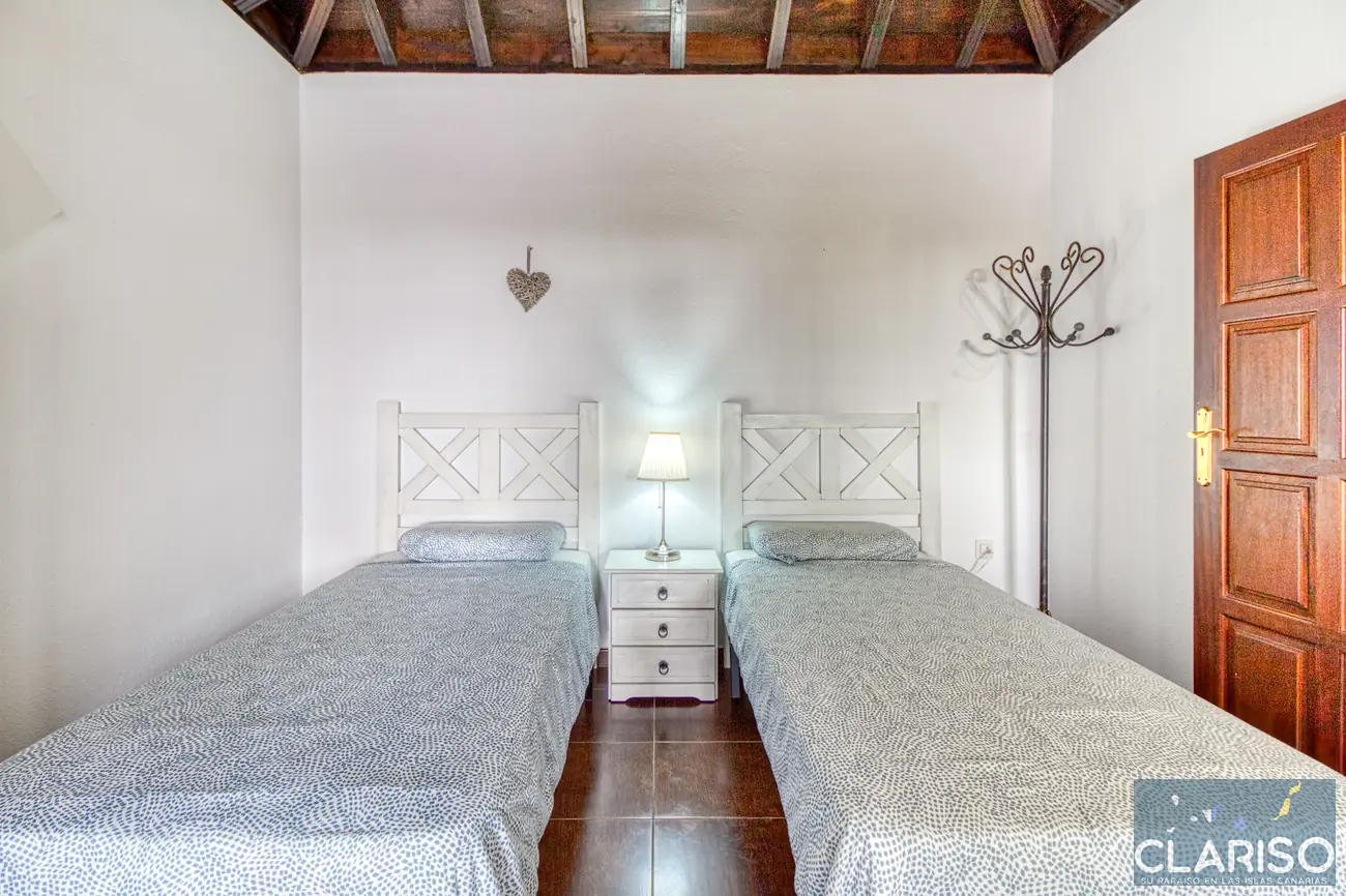 La casa ofrece dos dormitorios: uno con cama doble y otro con tres camas individuales, dos de ellas separadas por una mesita de noche, y una tercera cama ubicada algo aparte. Este dormitorio amplio también cuenta con un sillón ideal para leer o descansar. También aquí el techo de madera canario proporciona un ambiente típico y acogedor.