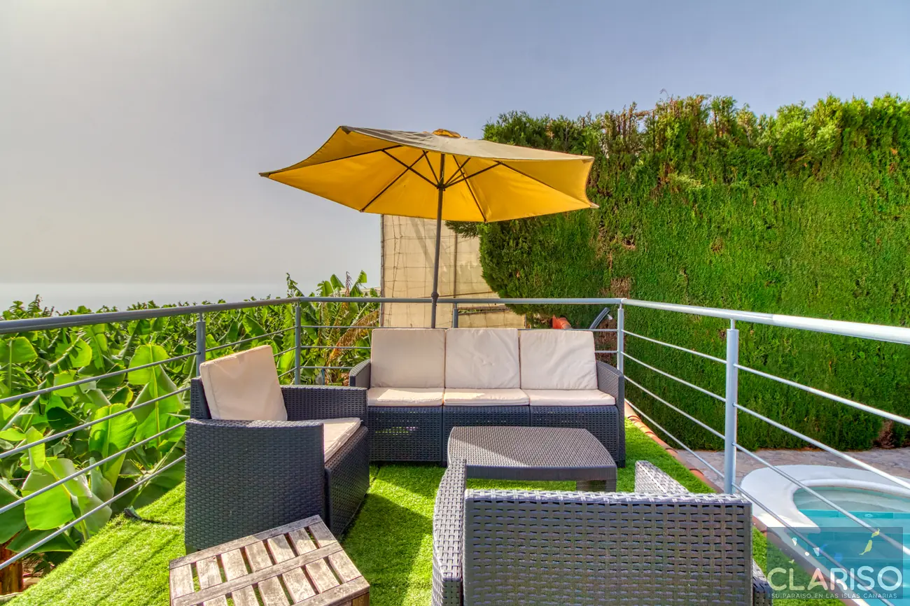 Un punto destacado es la zona de lounge elevada con muebles de exterior y sombrilla, situada sobre un pequeño pedestal. Desde aquí se disfrutan impresionantes vistas al mar y a las montañas, ideal para relajarse, leer o simplemente disfrutar.