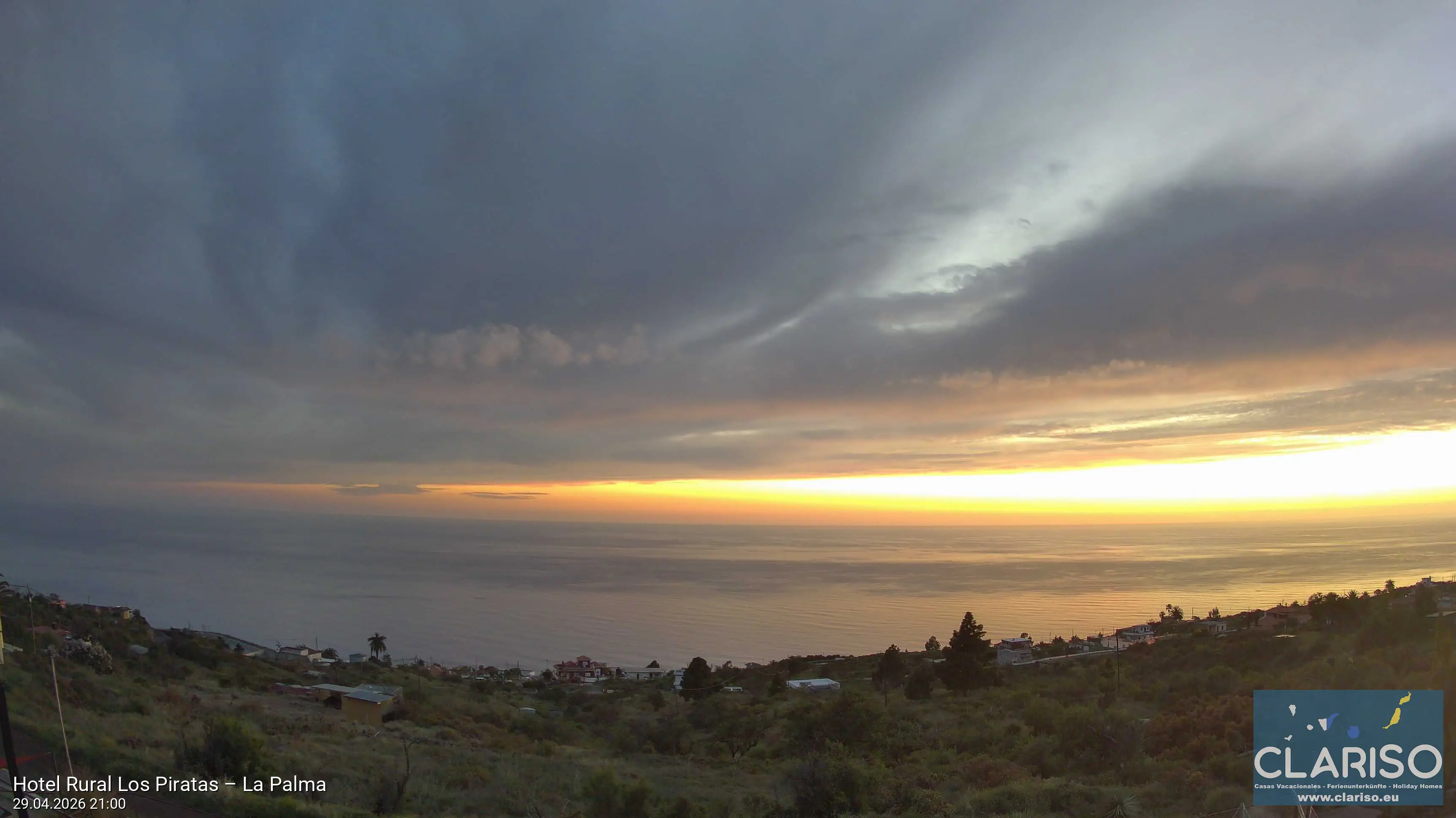 La webcam en directo muestra la vista desde el Hotel Rural Los Piratas en Tijarafe, en la costa oeste de La Palma. Aquí los huéspedes disfrutan cada día de espectaculares puestas de sol sobre el océano Atlántico, una ubicación tranquila sobre la costa y una de las vistas más hermosas de la isla.