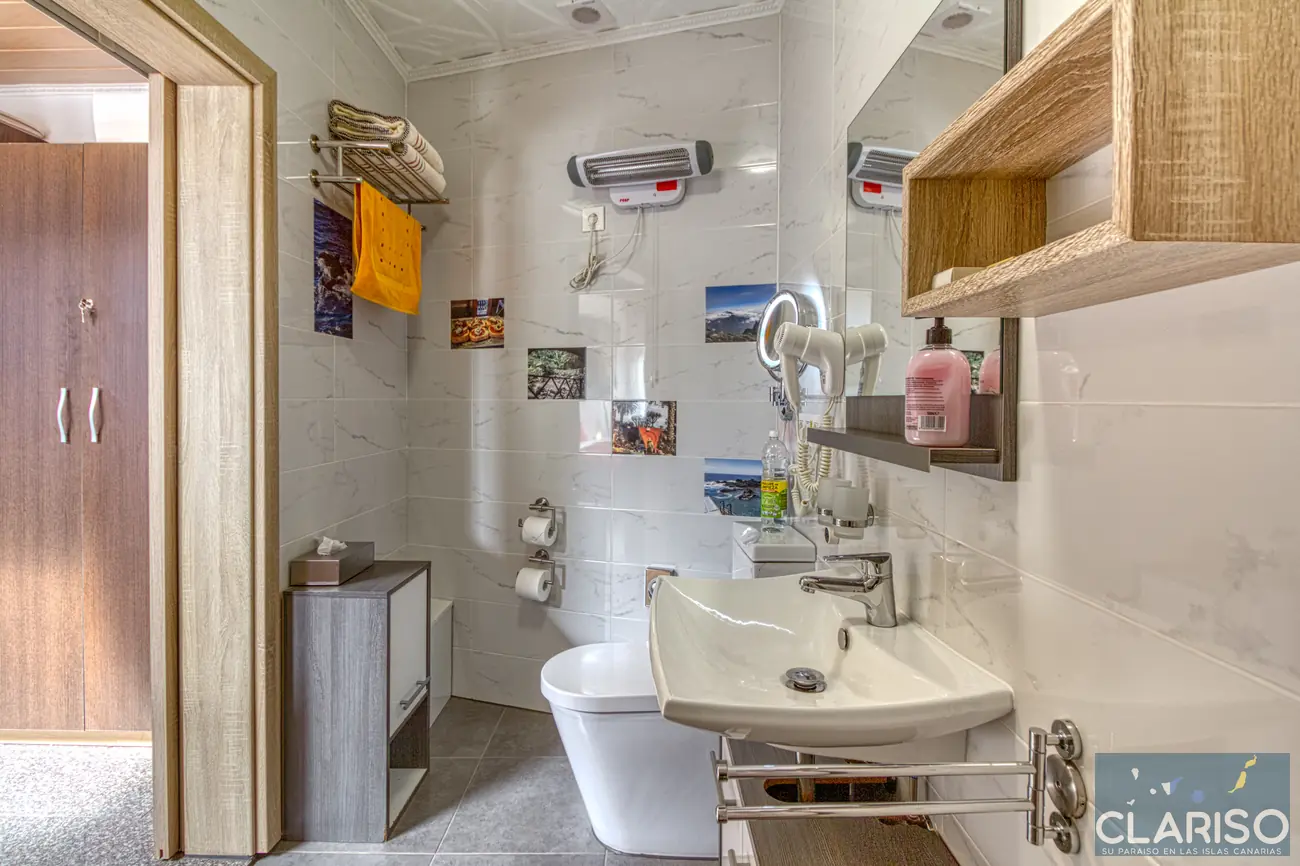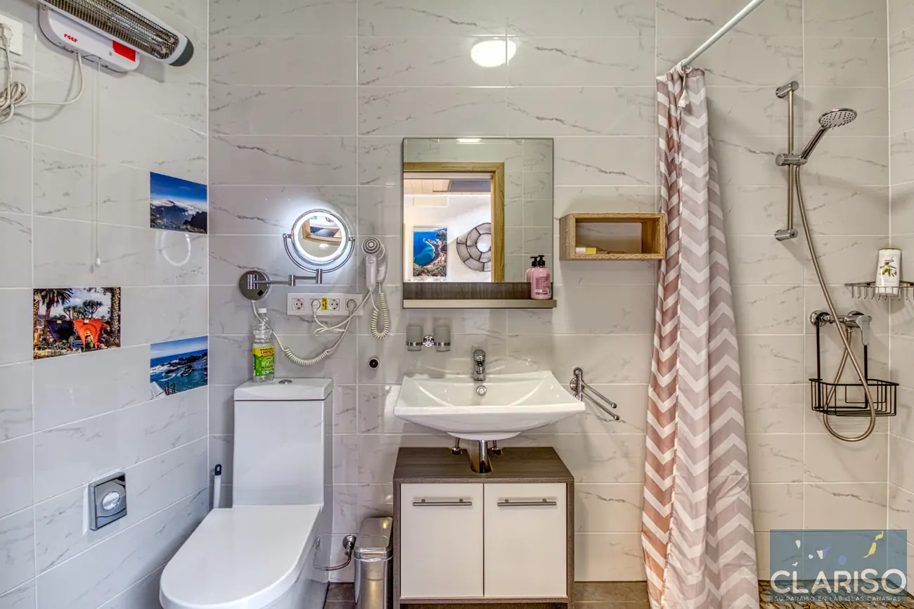 The modern bathroom is equipped with a walk-in shower, washbasin, toilet, make-up mirror and hairdryer.