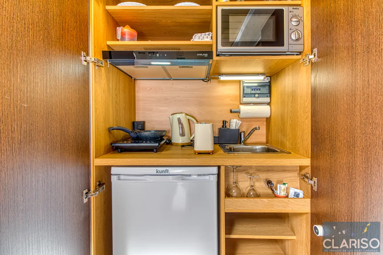 – Compact kitchenette (hob, microwave, fridge, citrus press, dishes, glasses, cutlery)