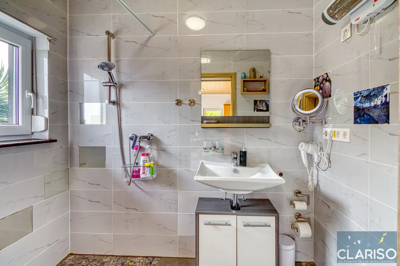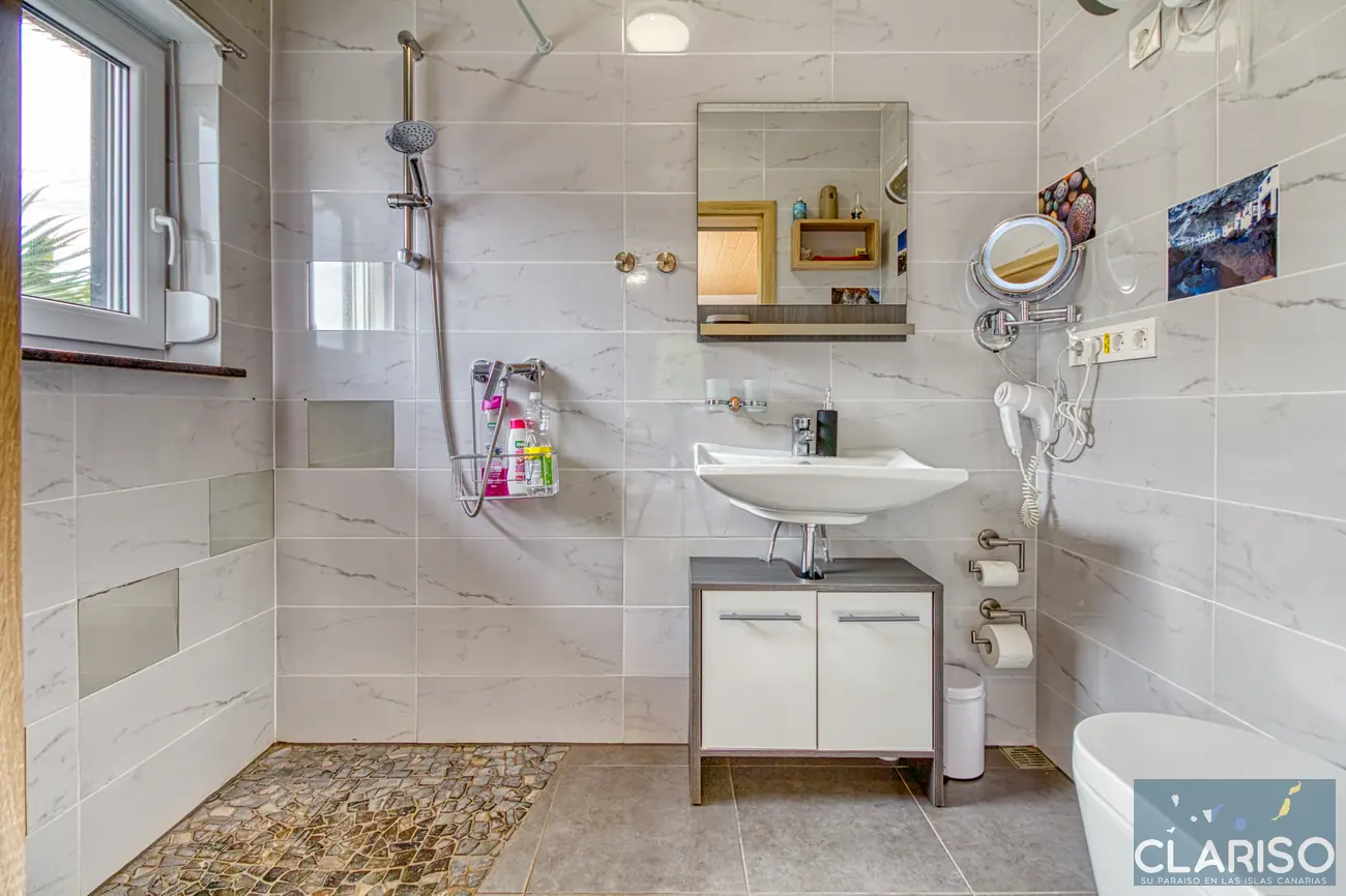 La salle de bain moderne est lumineuse et confortable, avec douche à l’italienne, lavabo, WC, miroir cosmétique et sèche-cheveux.