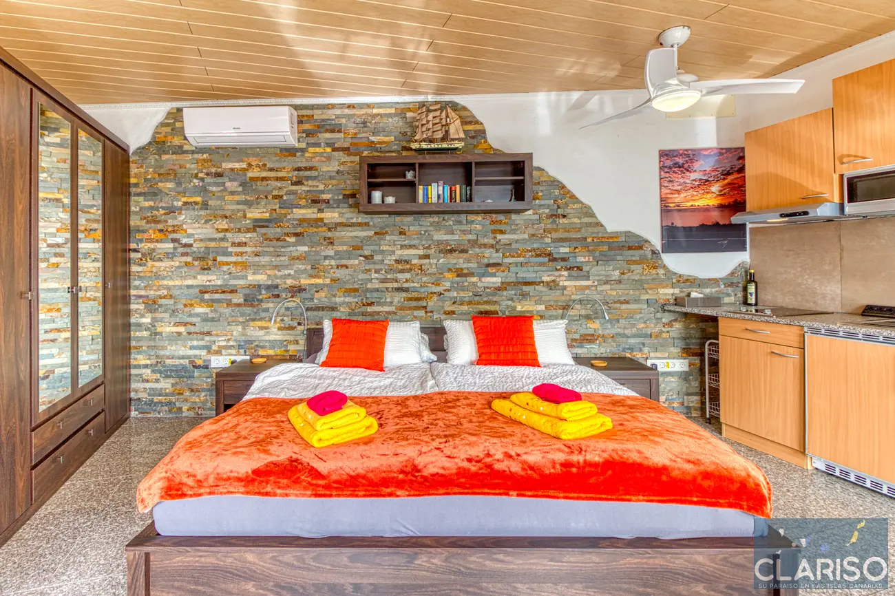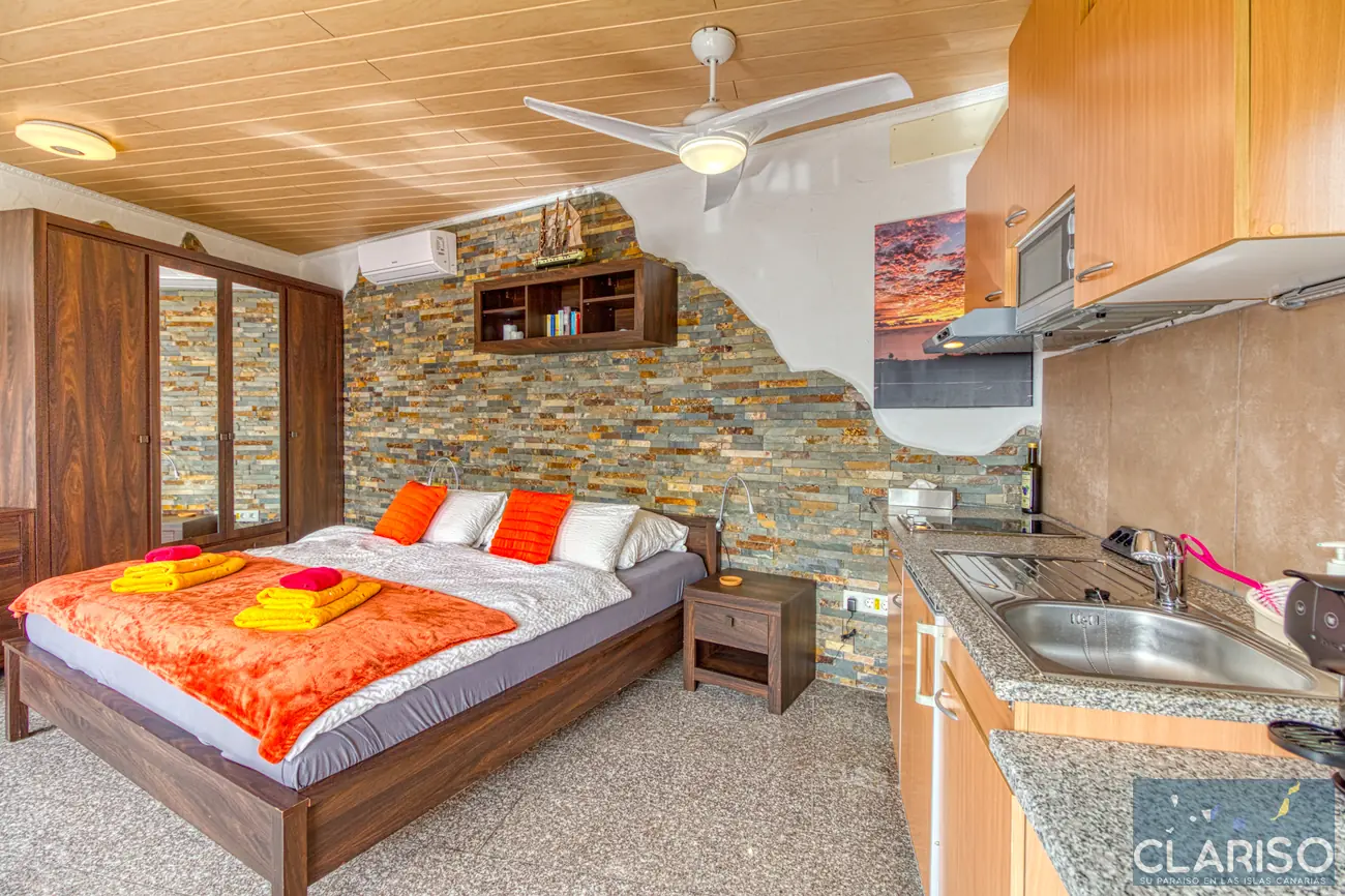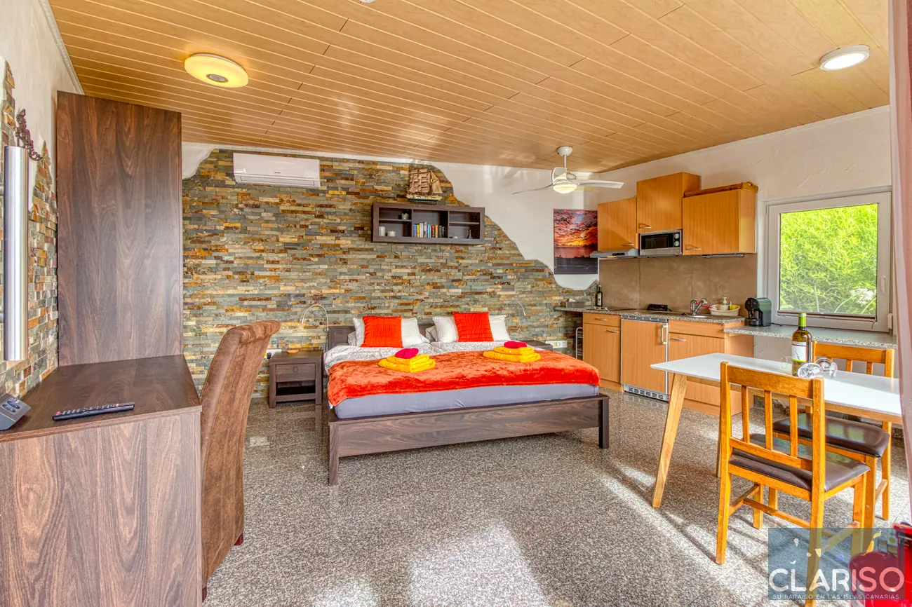 L’espace chambre et salon est lumineux, moderne et fonctionnel. Un grand lit double garantit un sommeil réparateur. On y trouve également un bureau et une table à manger avec des chaises. L’équipement comprend aussi TV, climatisation, chaises et une armoire.