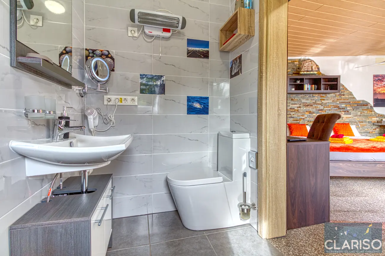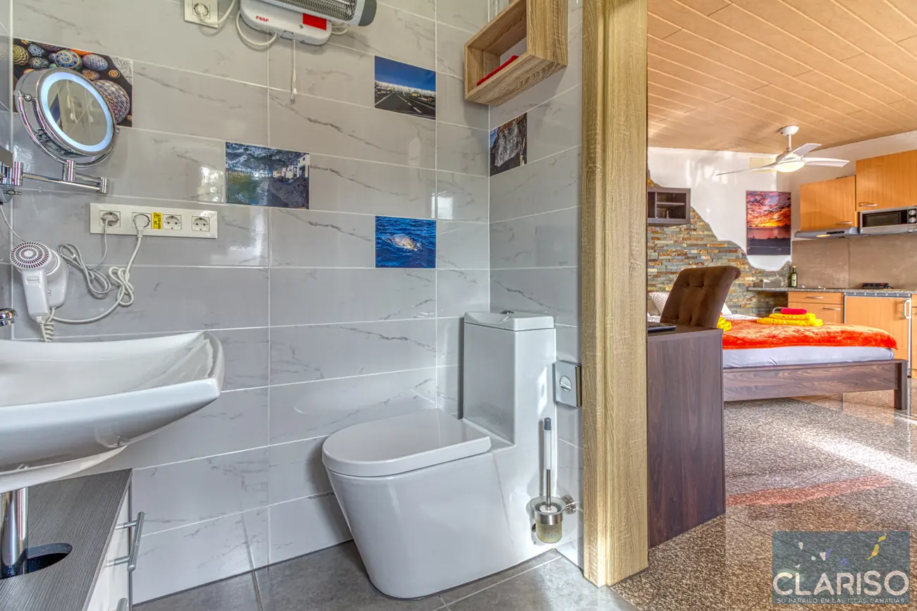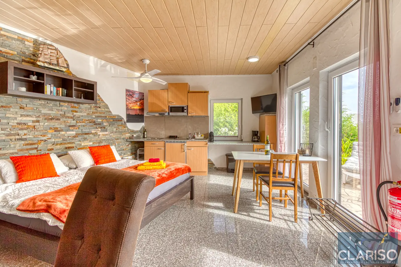 L’espace chambre et salon est lumineux, moderne et fonctionnel. Un grand lit double garantit un sommeil réparateur. On y trouve également un bureau et une table à manger avec des chaises. L’équipement comprend aussi TV, climatisation, chaises et une armoire.