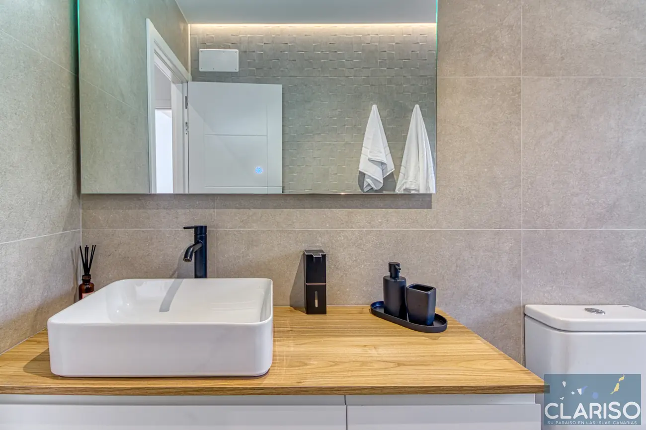 Le sol stratifié du salon et des chambres crée une atmosphère chaleureuse, tandis que la cuisine et les salles de bain présentent un carrelage moderne. L’association de la lumière, du bois et de lignes épurées confère à la villa une ambiance claire et accueillante.