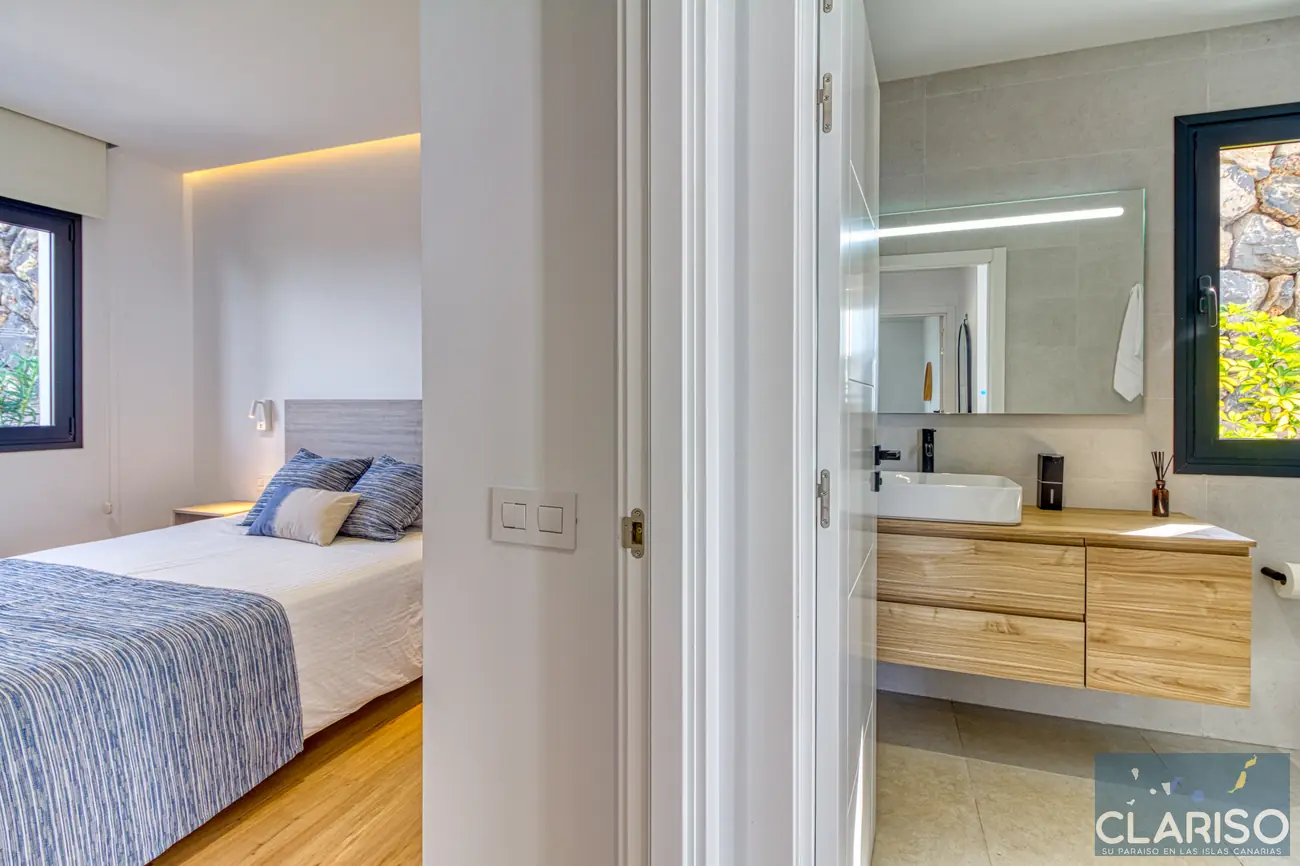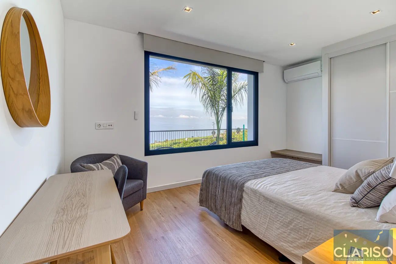La chambre principale offre calme et intimité grâce à un accès séparé. Elle comprend une salle de bain privée avec baignoire à hydromassage et douche à l’italienne. La chambre est meublée d’un lit double confortable, d’une armoire, d’un bureau, d’un fauteuil et de la climatisation. La grande baie vitrée permet de profiter d’une vue directe sur la mer et de merveilleux couchers de soleil.