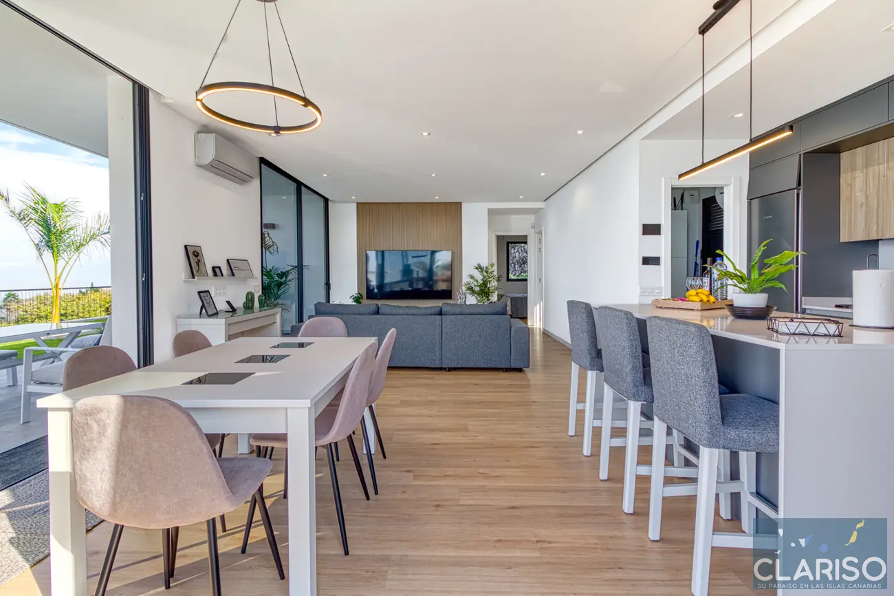 Le séjour ouvert dispose de grandes baies vitrées orientées sud et ouest, offrant une vue magnifique sur la piscine à débordement, la terrasse et l’océan. L’espace spacieux réunit la cuisine, la salle à manger et le salon dans une ambiance lumineuse et conviviale. Un grand canapé, une télévision, une table à manger et la climatisation assurent un confort total. Un éclairage indirect crée une atmosphère chaleureuse en soirée.