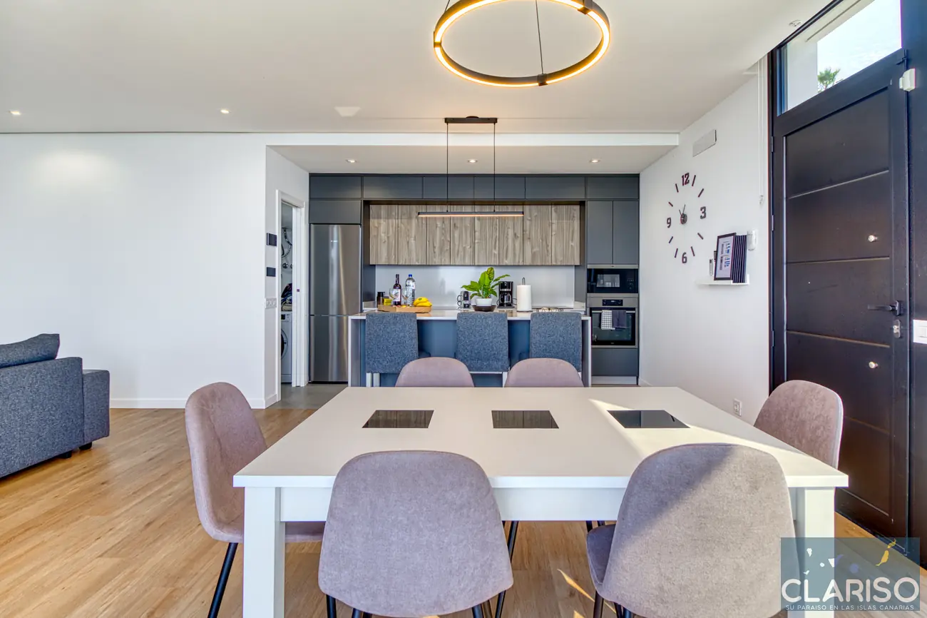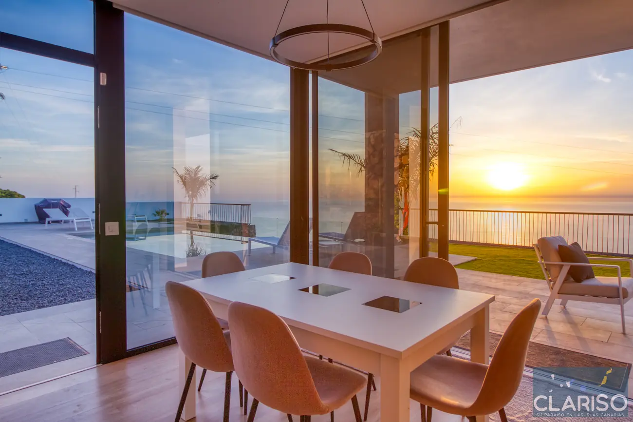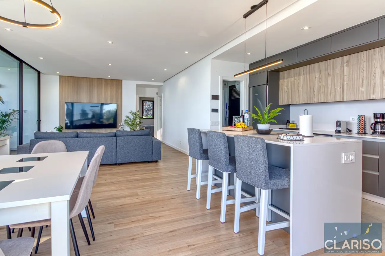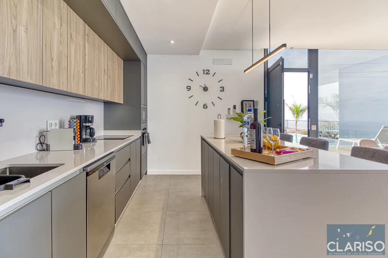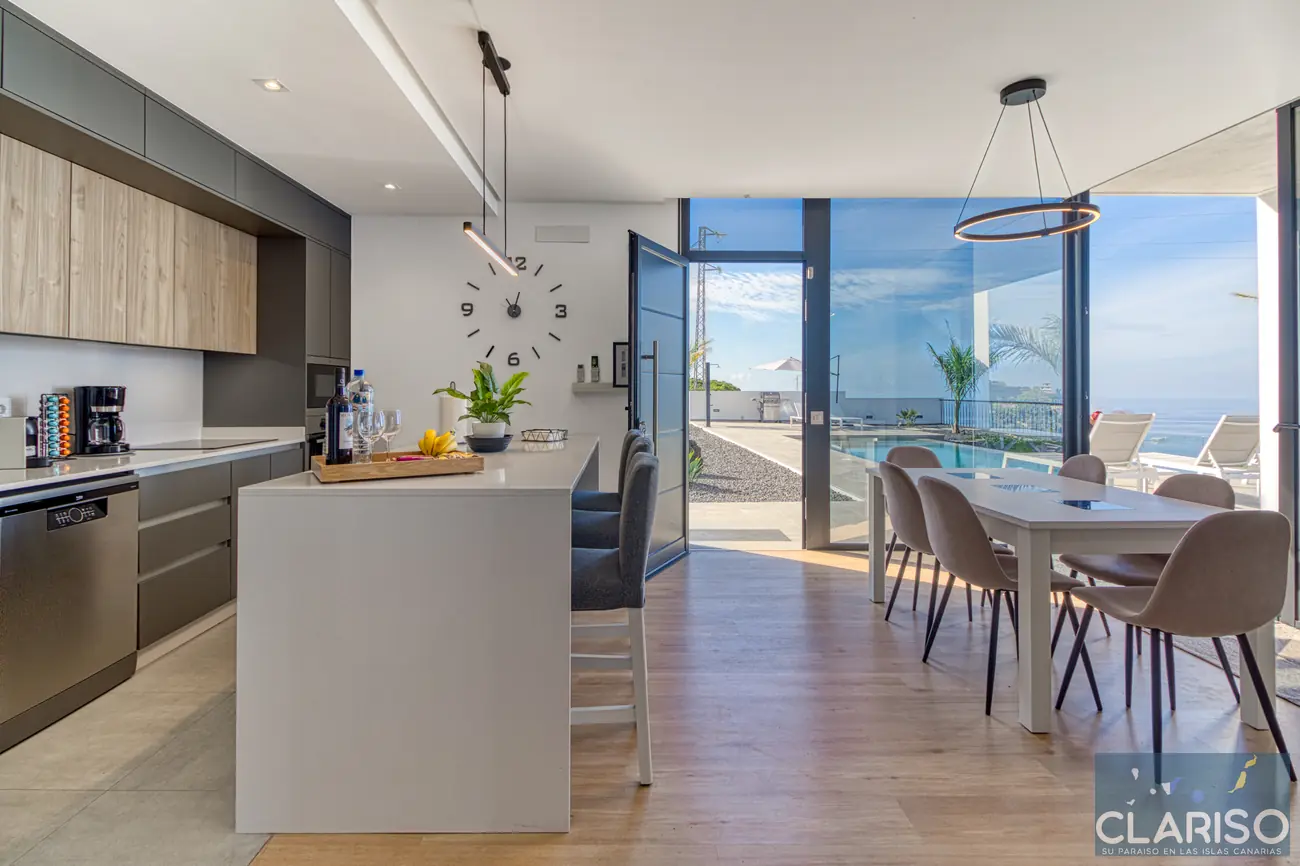 De open woonkamer met grote ramen op het zuiden en westen biedt vanuit elke hoek uitzicht op het infinity-zwembad, het terras en de oceaan. De ruime indeling combineert de keuken, eethoek en lounge tot een helder, uitnodigend geheel. Een comfortabele zithoek, grote tv, eettafel en airconditioning zorgen voor een ontspannen sfeer. Indirecte verlichting geeft ’s avonds een warme uitstraling.