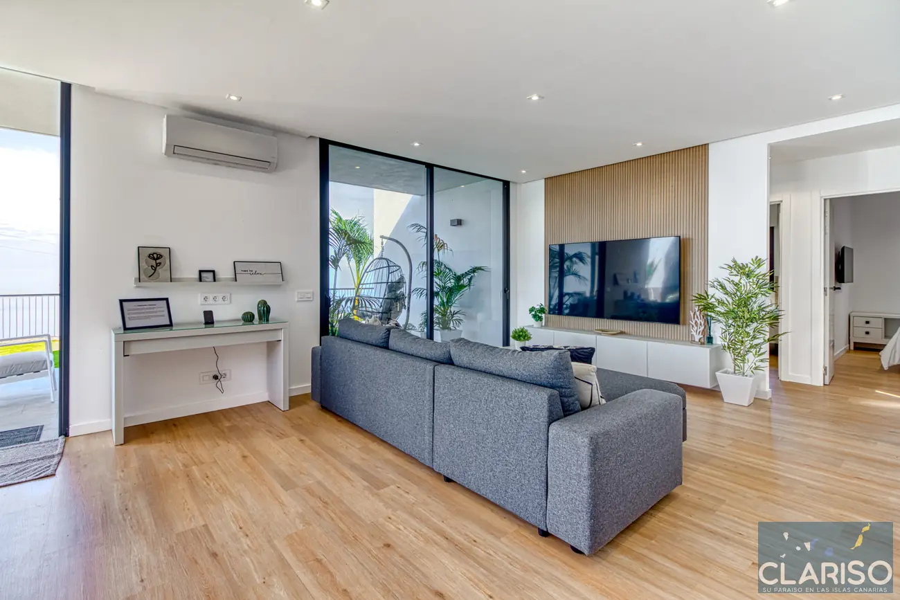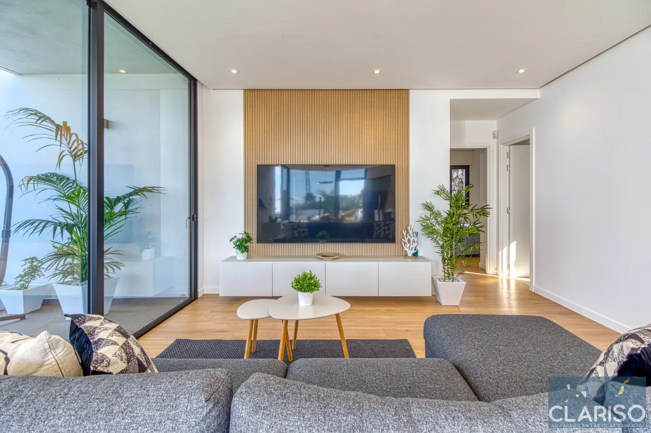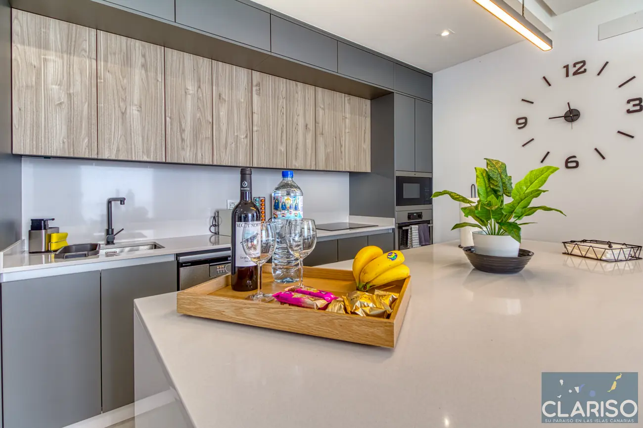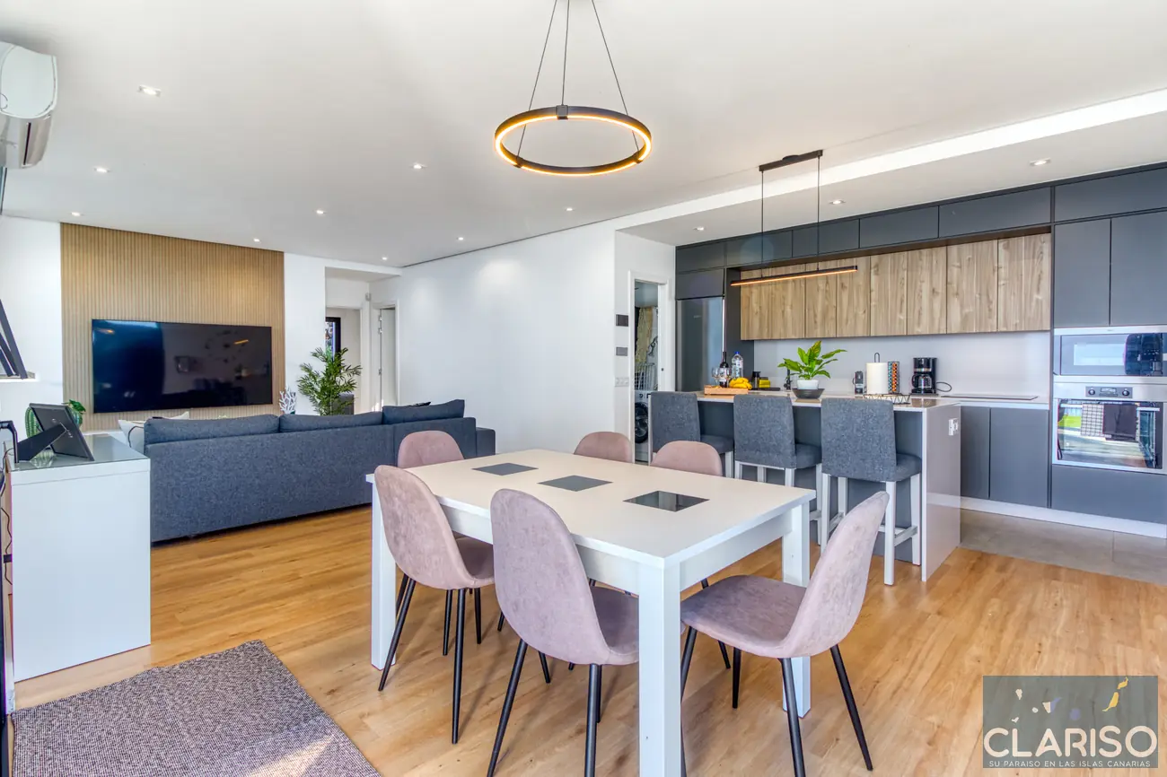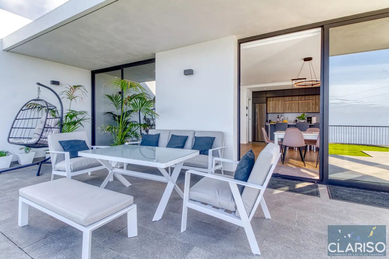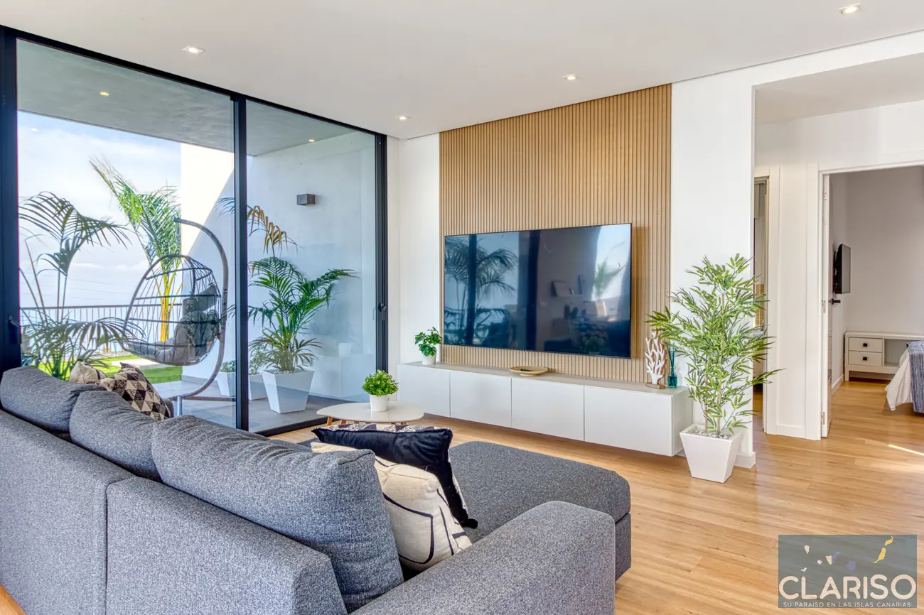 De open woonkamer met grote ramen op het zuiden en westen biedt vanuit elke hoek uitzicht op het infinity-zwembad, het terras en de oceaan. De ruime indeling combineert de keuken, eethoek en lounge tot een helder, uitnodigend geheel. Een comfortabele zithoek, grote tv, eettafel en airconditioning zorgen voor een ontspannen sfeer. Indirecte verlichting geeft ’s avonds een warme uitstraling.