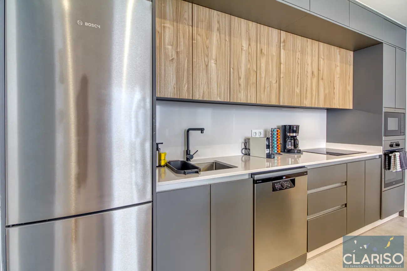 De open keuken is volledig uitgerust – functioneel, licht en ideaal voor zelfvoorziening. Er is voldoende werkruimte, moderne apparatuur en een aangrenzende wasruimte met wasmachine.