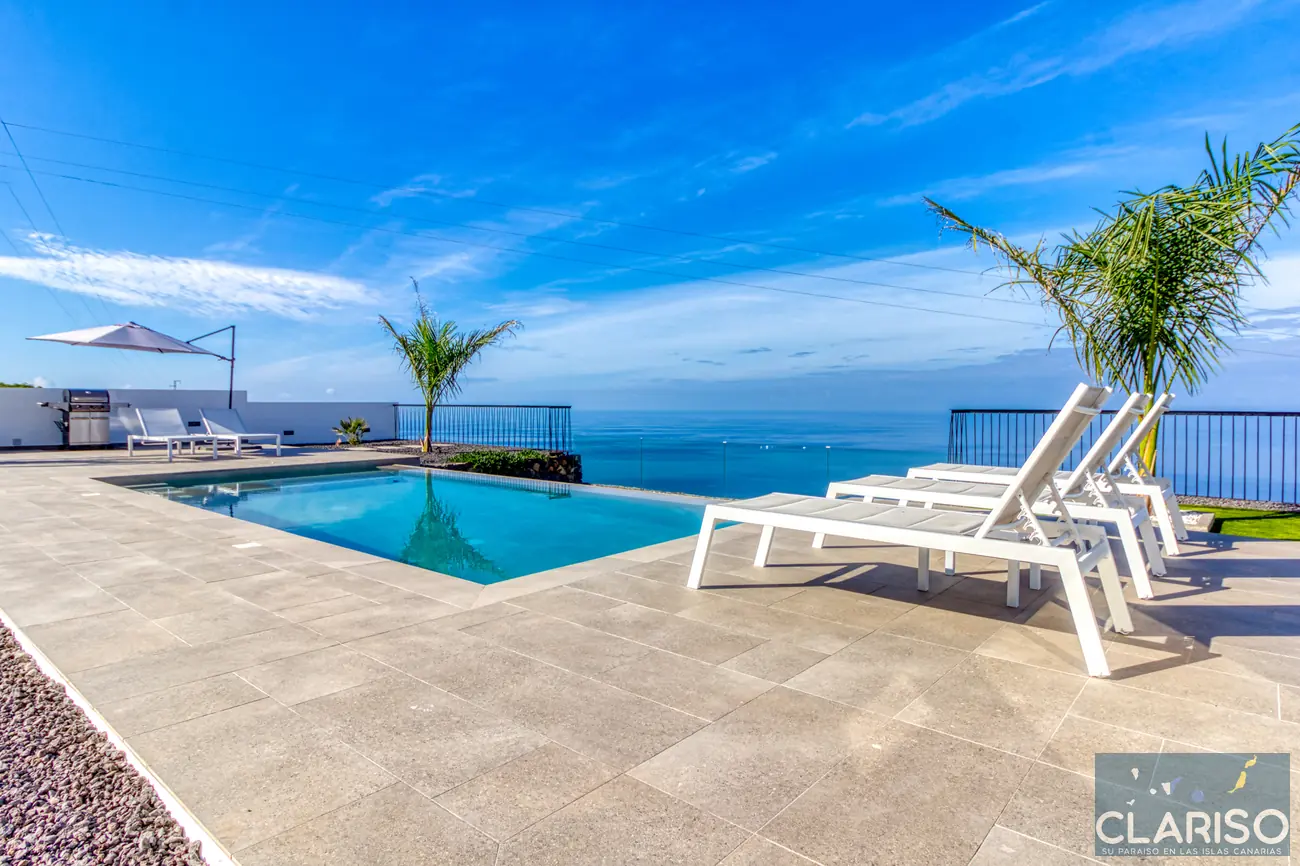 Buiten bevindt zich het infinity-zwembad met zeezicht, dat milieuvriendelijk wordt verwarmd door zonne-energie. Rondom het zwembad zijn ligstoelen, parasols, een zonnebuitendouche en een gasbarbecue.