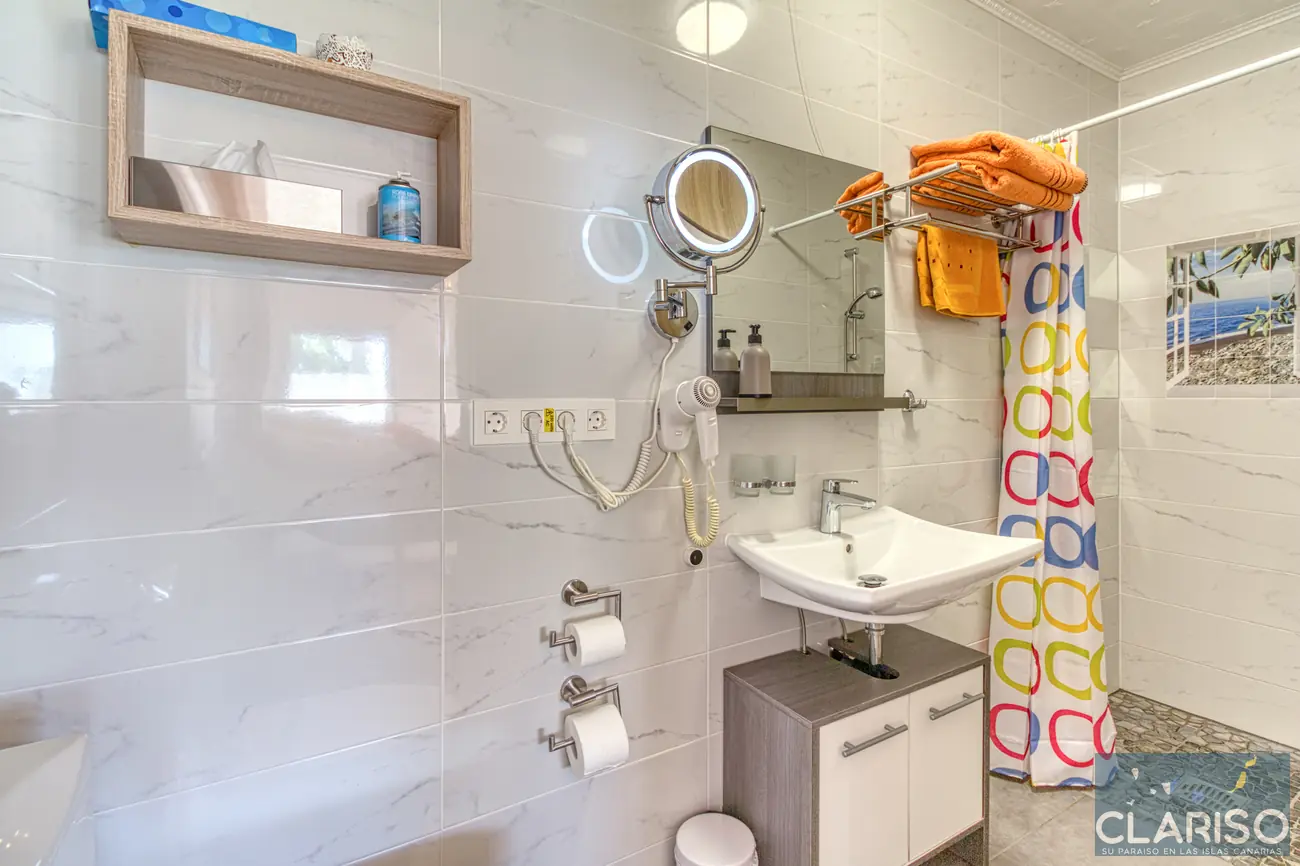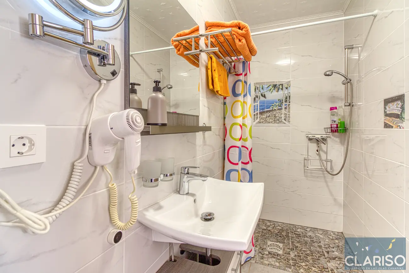 De badkamer beschikt over een wastafel, toilet en een inloopdouche. Een make-upspiegel en een föhn zijn uiteraard aanwezig.