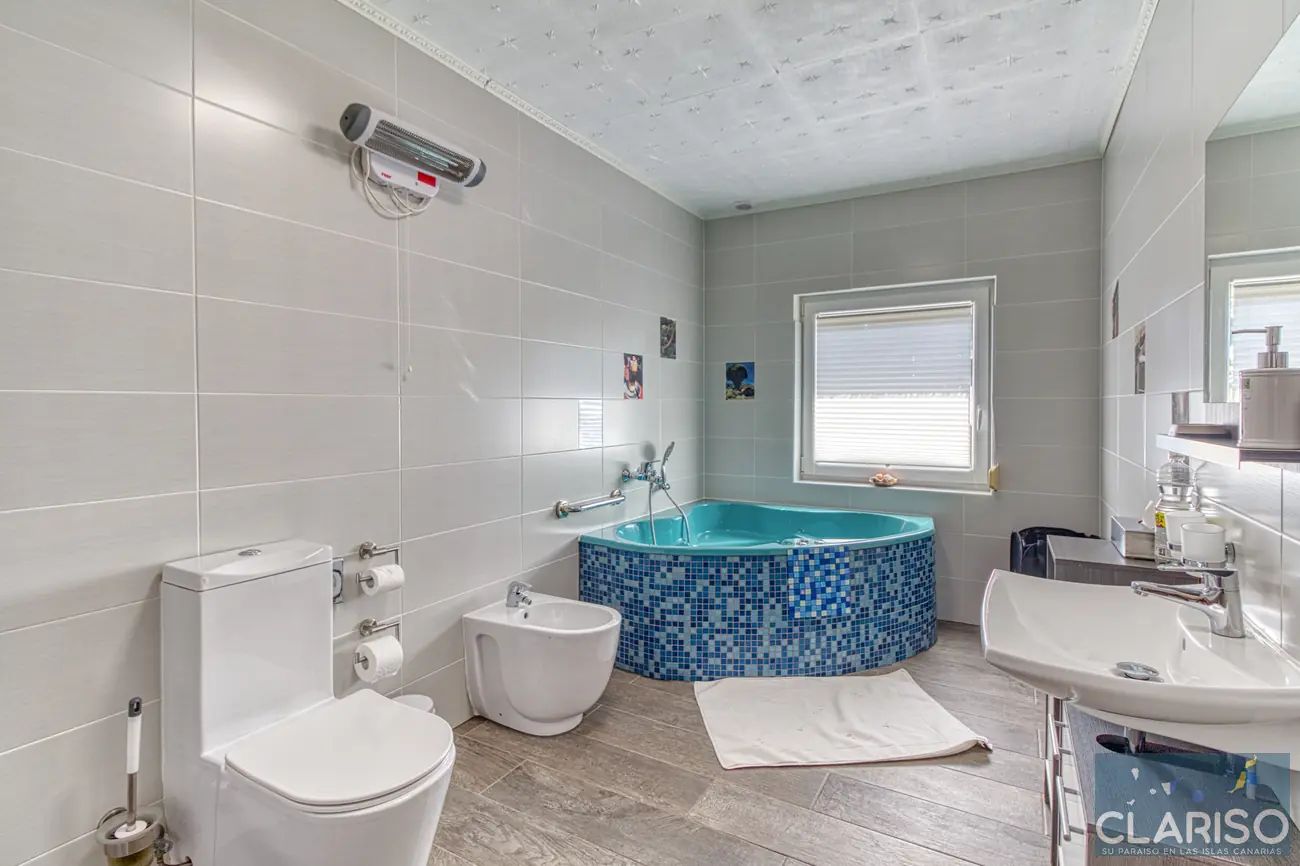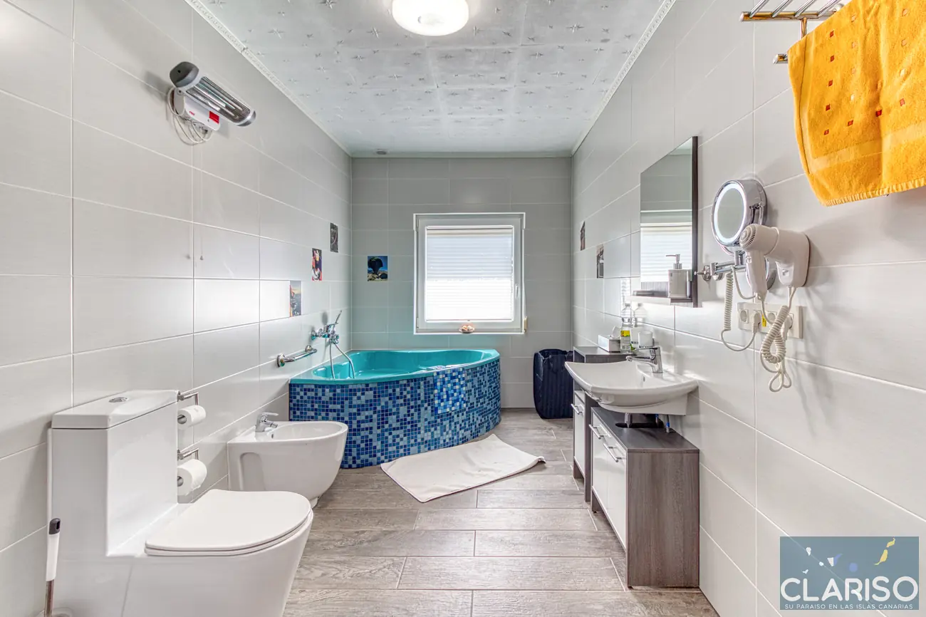 De badkamer is uitgerust met een hoekbad met whirlpoolfunctie, inloopdouche, wastafel met make-upspiegel, bidet en föhn – perfect voor ontspannende momenten.