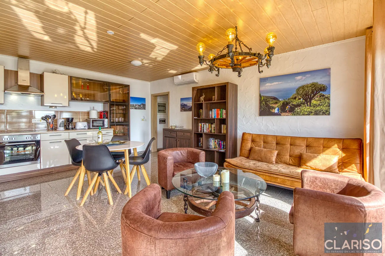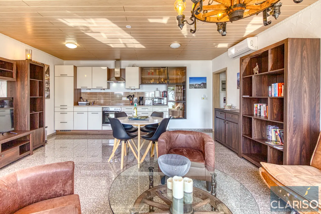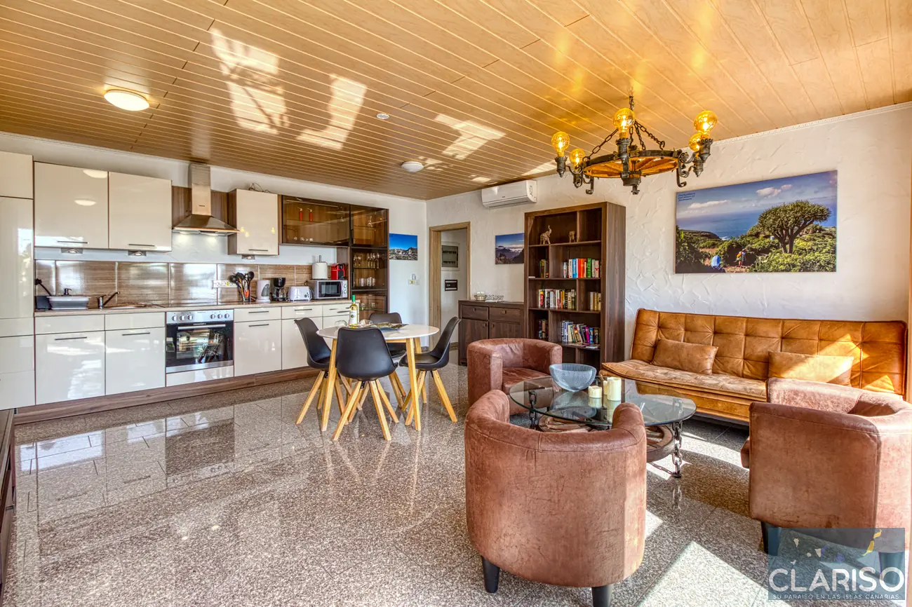 In de woonkamer heerst een lichte sfeer met een groot raam met zeezicht en toegang tot het privéterras. Er is een comfortabele slaapbank voor een derde gast, drie fauteuils, een bijzettafel, boekenkast, tv, airconditioning en een eettafel. De moderne open keuken is volledig uitgerust en biedt alles wat nodig is voor een langer verblijf.