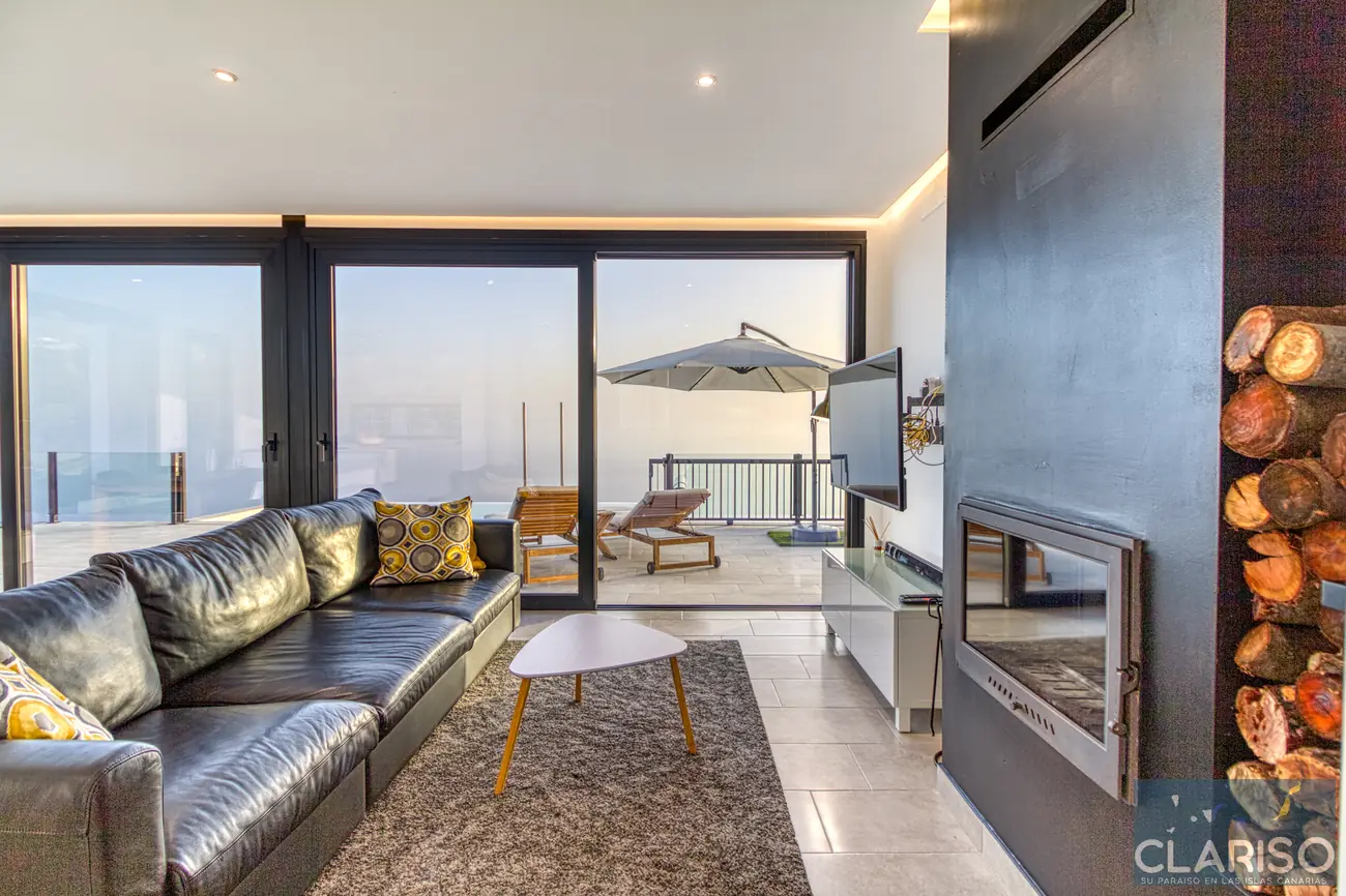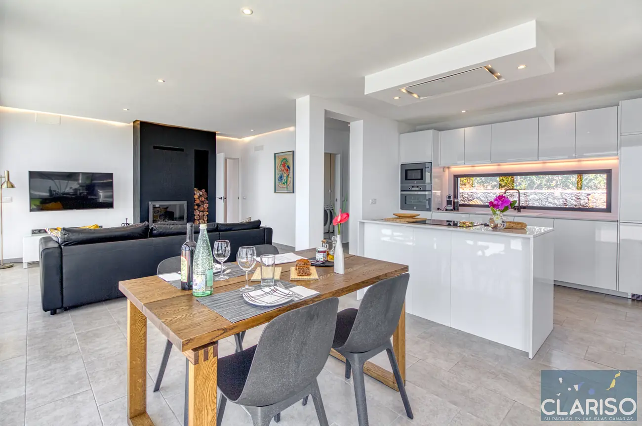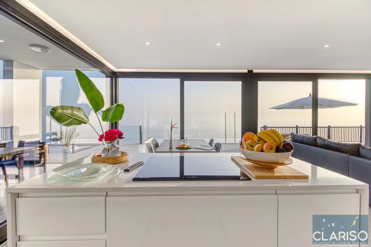 Binnen verwelkomt een open woon-, eet- en kookruimte die baadt in het daglicht. Grote raampartijen en schuifdeuren bieden vanuit bijna elke hoek uitzicht op zee en creëren een gevoel van ruimte en licht. De moderne keuken met kookeiland is zowel functioneel als esthetisch – zelfs tijdens het koken kun je via een achterraam van het uitzicht genieten. Een grote eettafel, een comfortabele bank, een tv en een stijlvolle haard zorgen het hele jaar door voor een behaaglijke sfeer. ’s Avonds zorgt de indirecte LED-plafondverlichting voor een warme, ontspannen ambiance.