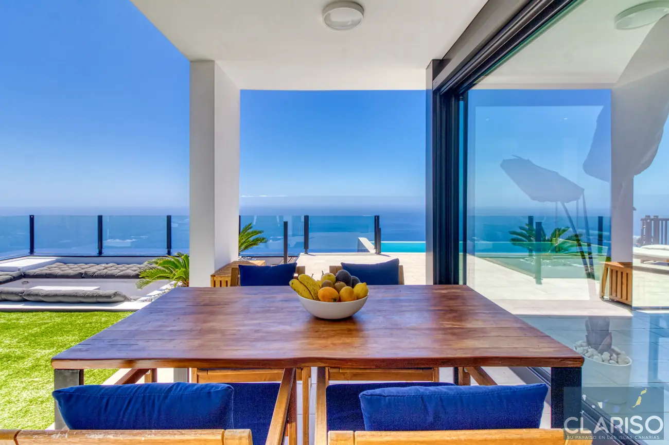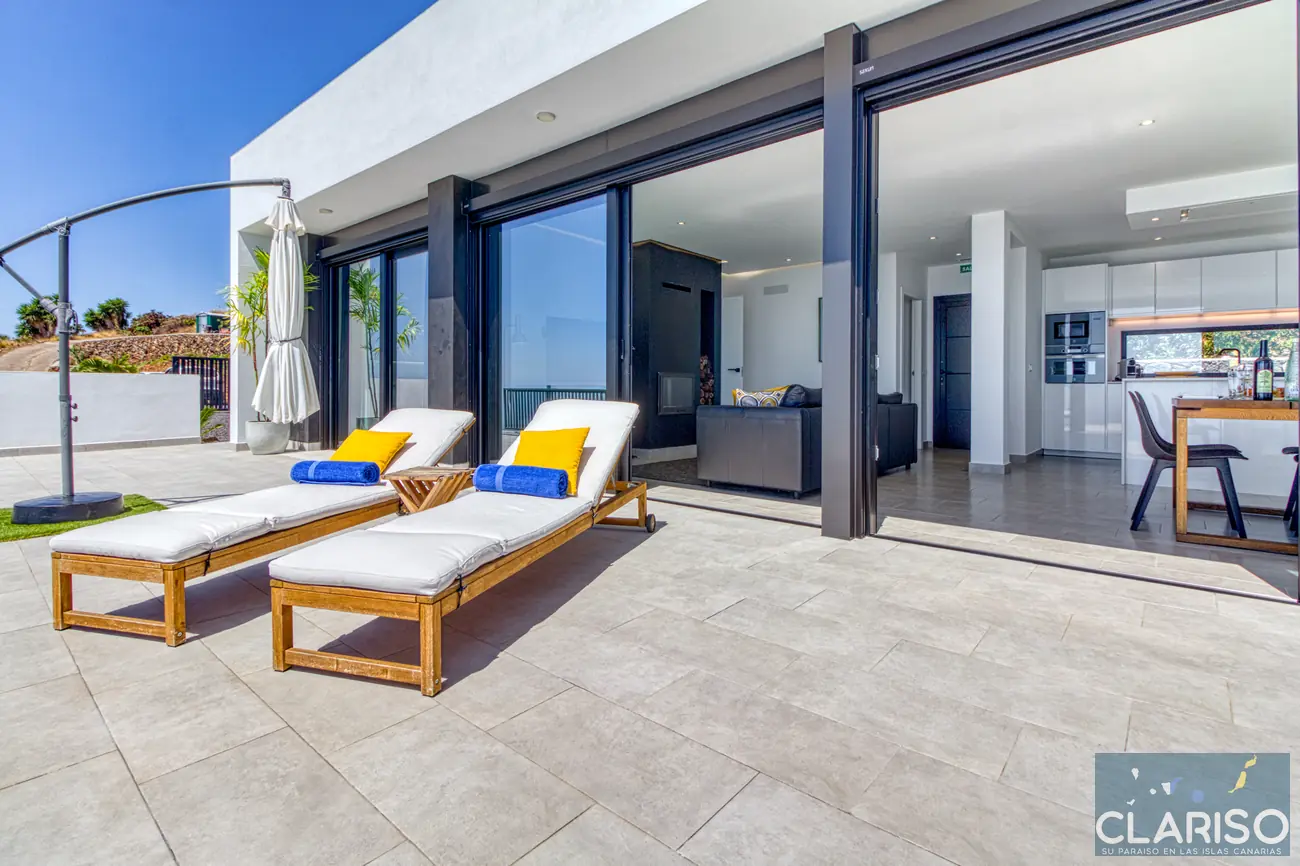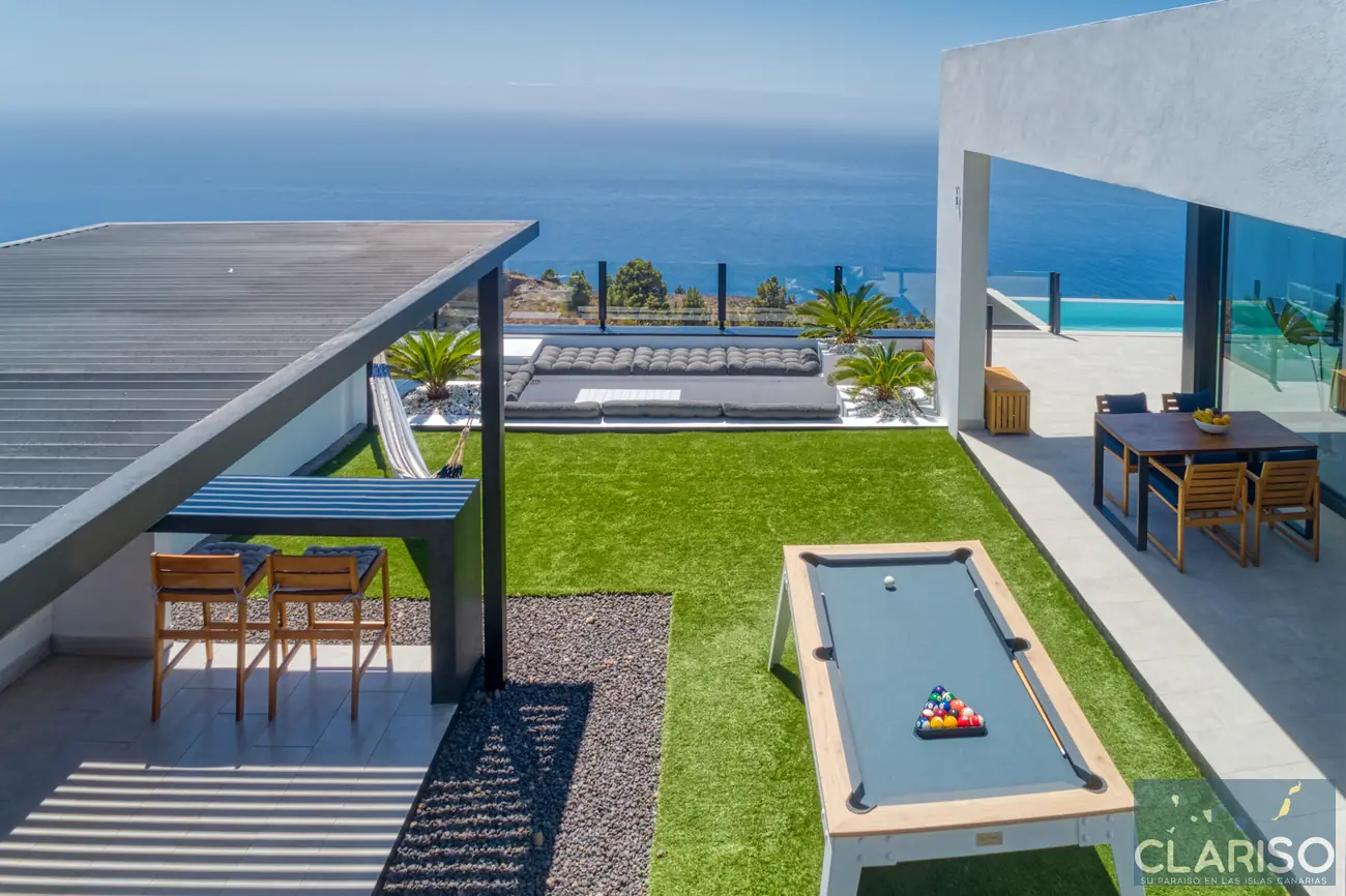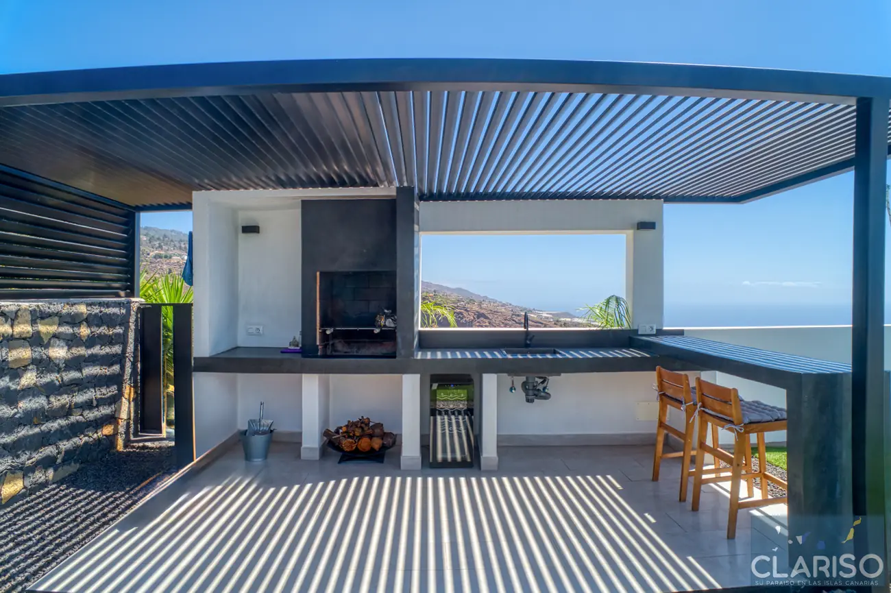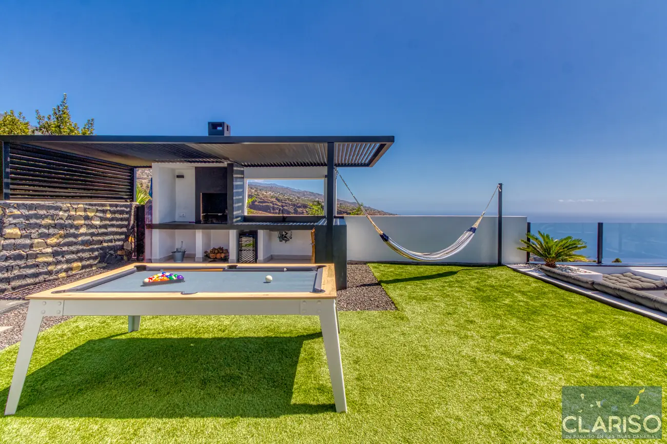 De barbecuehoek met buitenkeuken en bar nodigt uit tot lange, gezellige avonden. Een wijnkoelkast (tegen betaling) houdt zorgvuldig geselecteerde wijnen gekoeld, terwijl je aan tafel uitkijkt over de barranco en het zuiden van het eiland. De overdekte veranda biedt nog een idyllische zit- of eethoek. De buitenruimte wordt aangevuld met een buitendouche, een biljarttafel, privéparkeerplaatsen direct bij het huis, snel wifi en een duurzame stroomvoorziening via zonnepanelen.