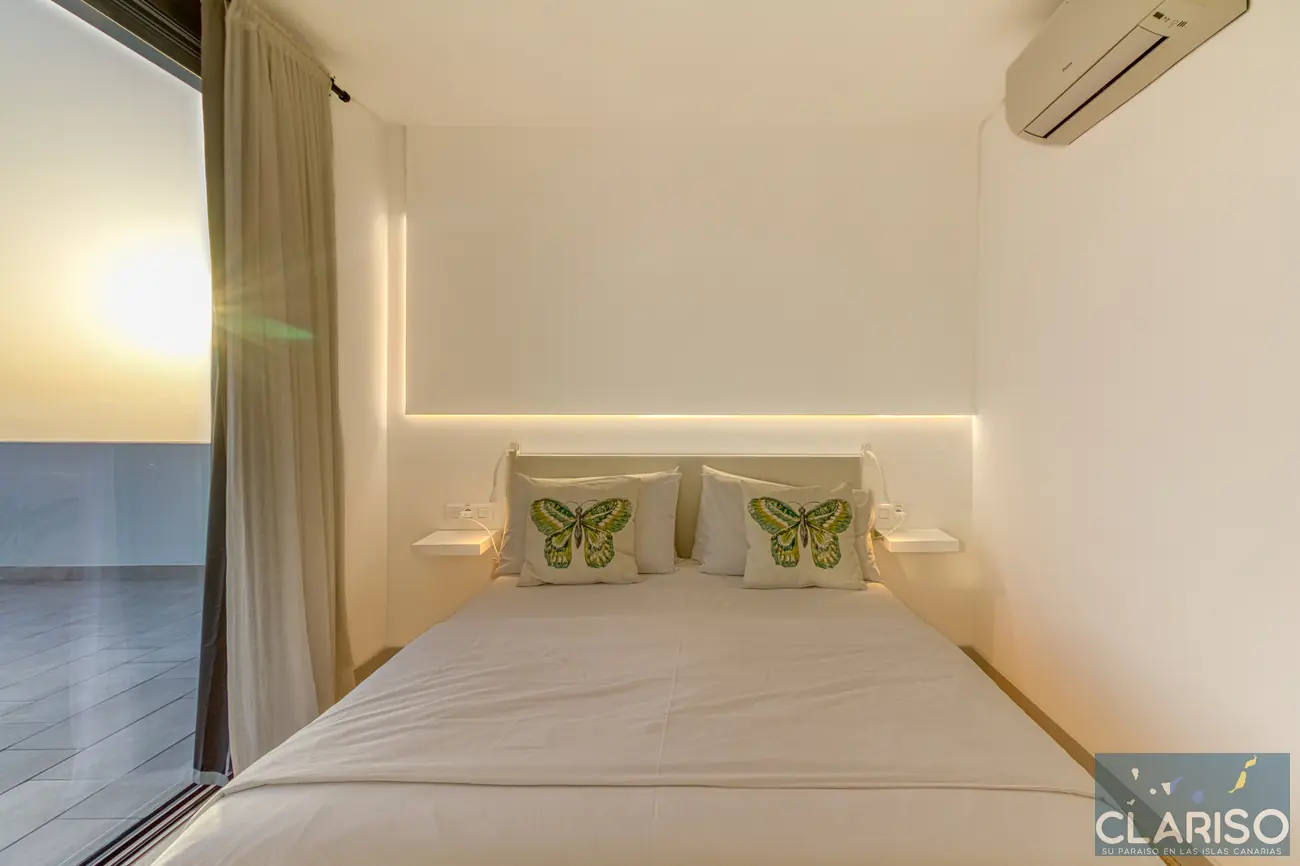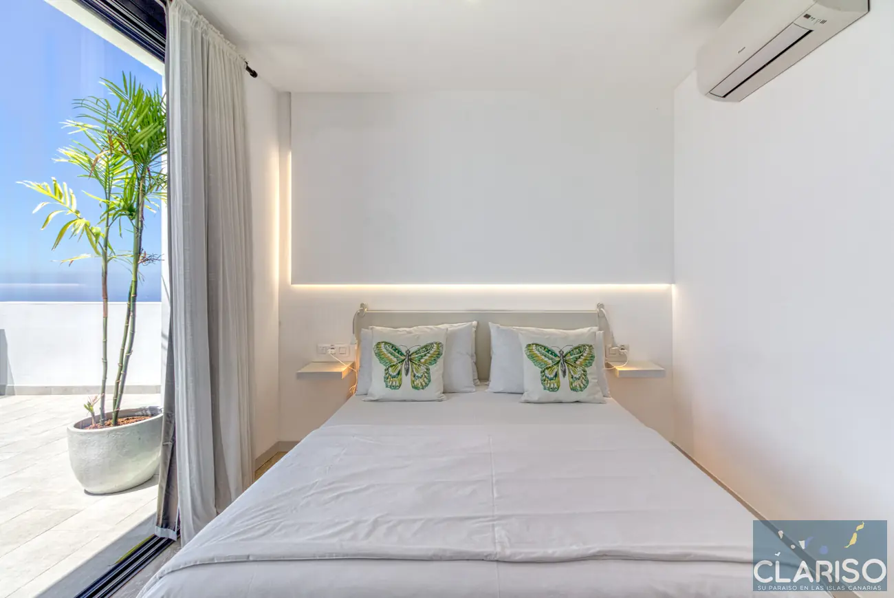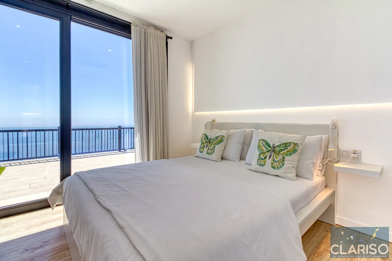 De slaapkamer met tweepersoonsbed biedt dankzij een grote schuifpui met zeezicht een heerlijk wakker worden met uitzicht. Airconditioning en een tv zorgen voor extra comfort. Een open garderoberuimte met elegant ontwerp leidt naar de moderne badkamer, die in twee delen is verdeeld: vooraan een wastafel met spiegel, daarachter een inloopdouche (met regendouche en massagefunctie) en een apart toilet.